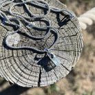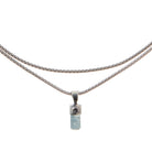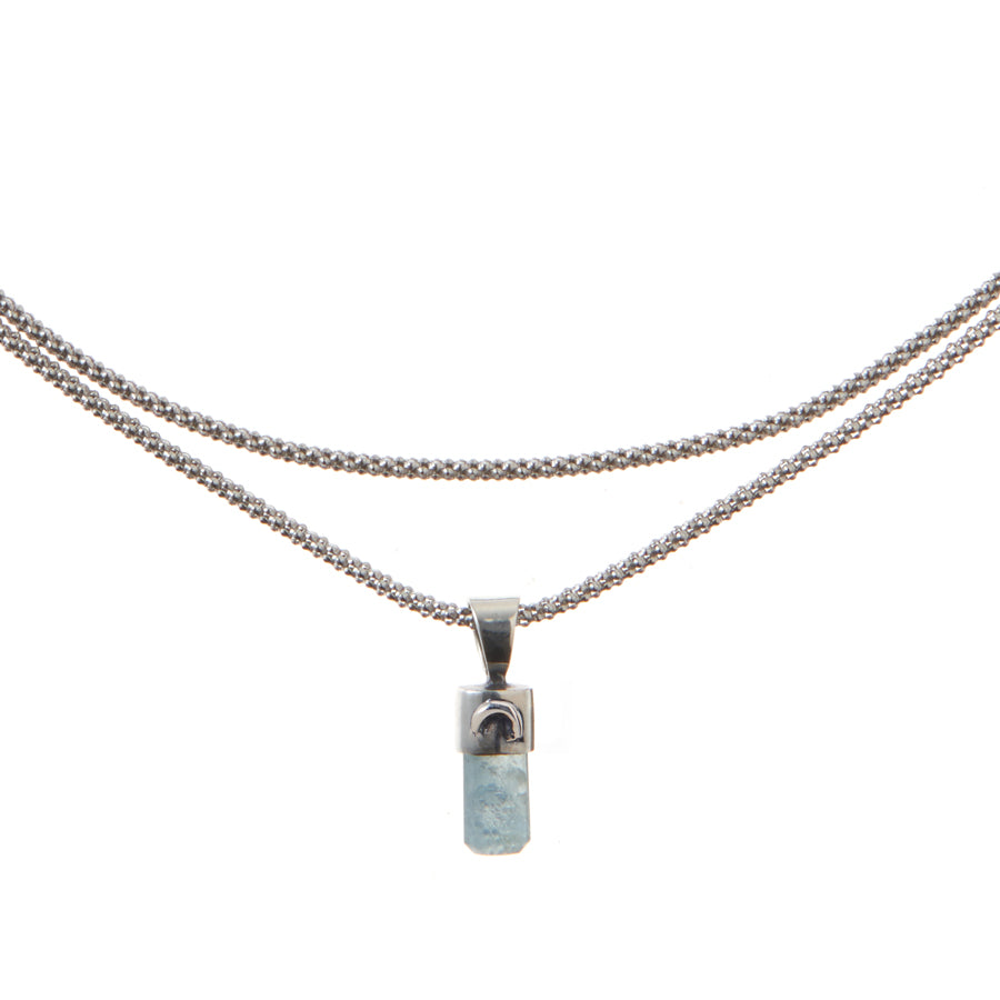 Cadena larga espigada con colgante trabajado en Plata de Ley y piedra Aguamarina natural central. Colgante de piedra Aguamarina con plata de ley superior trabajada con dibujo de luna de aproximadamente 2 cm de alto. El colgante y la cadena tienen un acabado oxidado (pátina oscura que se le da a la plata para crear un efecto envejecido que de profundidad al dibujo).