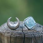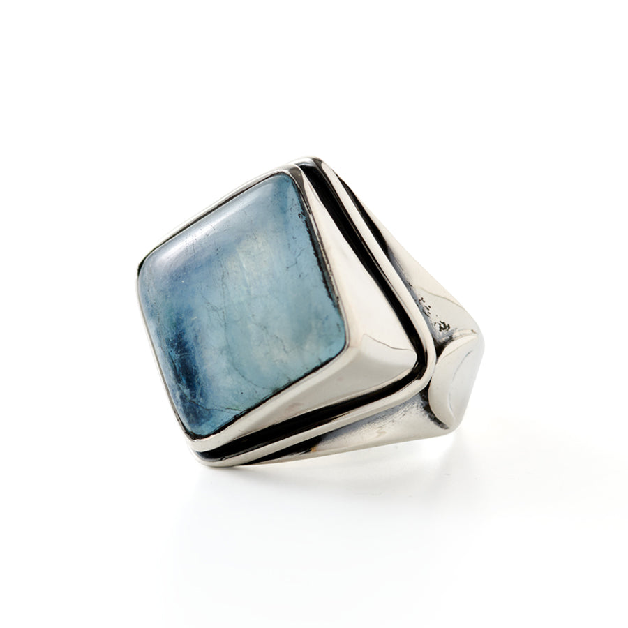 Anillo con piedra Aguamarina natural central en forma de rombo de aproximadamente 2 cm de alto. Trabajado en Plata de Ley oxidada, pátina oscura