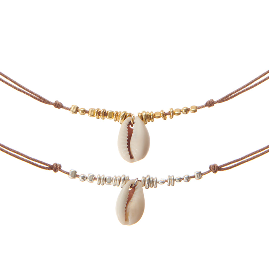 Collar de hilo ajustable hecho a mano con concha natural central y combinación de entre piezas en plata de ley ó en plata de ley bañadas en oro.