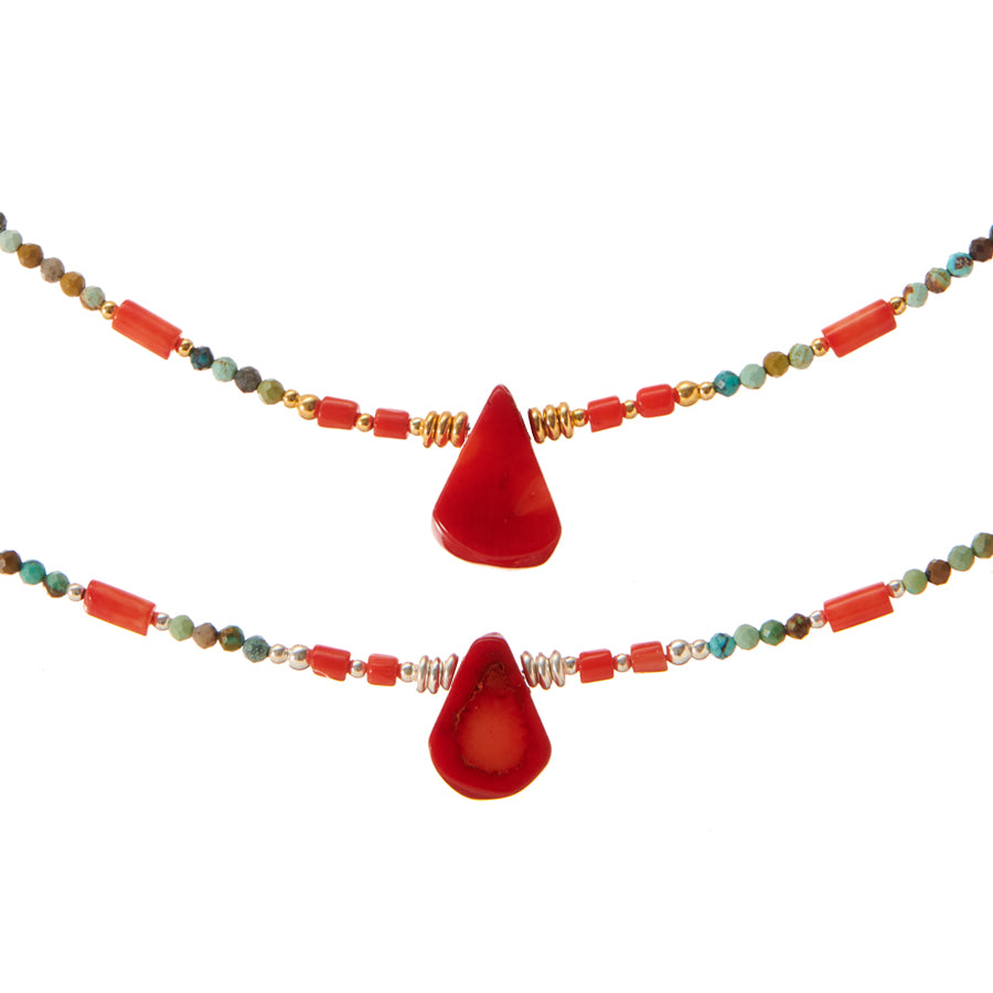 Gargantilla hecha a mano con piedra Turquesa, entre piezas en plata de ley y cuentas y pieza central en forma de lágrima de Coral Bambú.