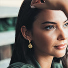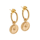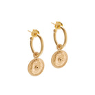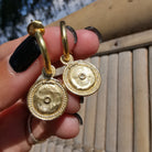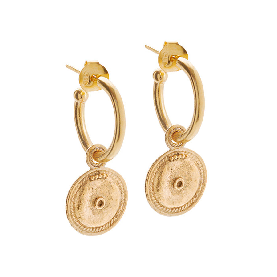 Pendientes de 16mm de diámetro y 2mm de grosor, con una medalla hecha a mano de aproximadamente 14mm de diámetro. Material: Plata de primera ley con baño de oro de 18/24K de 1 micra de espesor.