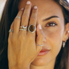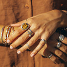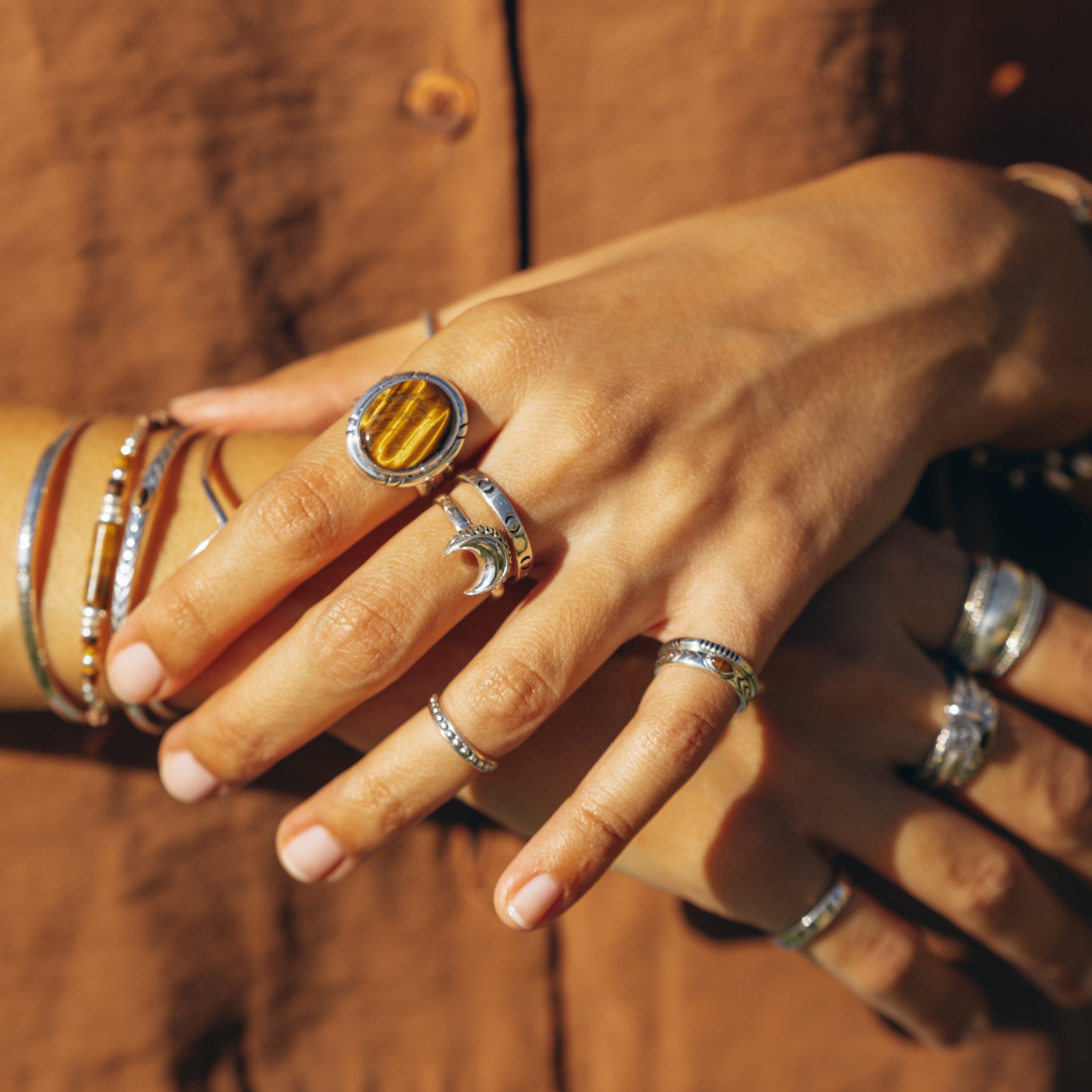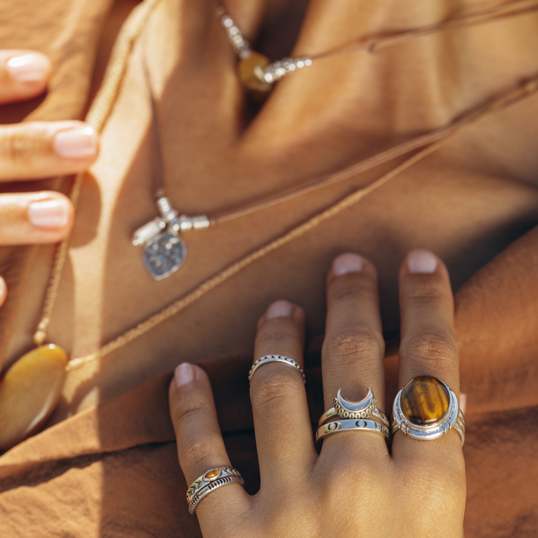 Anillo ajustable con piedra Ojo de tigre natural central en forma de ojo de aproximadamente 2 x 4mm. Trabajado en Plata de Ley oxidada, pátina oscura que se le da a la plata 925 para crear un efecto envejecido que de profundidad al dibujo. Material: Plata de Ley y piedra Ojo de tigre natural. *Este tipo de piedra natural puede variar bastante su veteado y tonalidad de color en función del corte de piedra usado para cada anillo. Cada pieza es única.