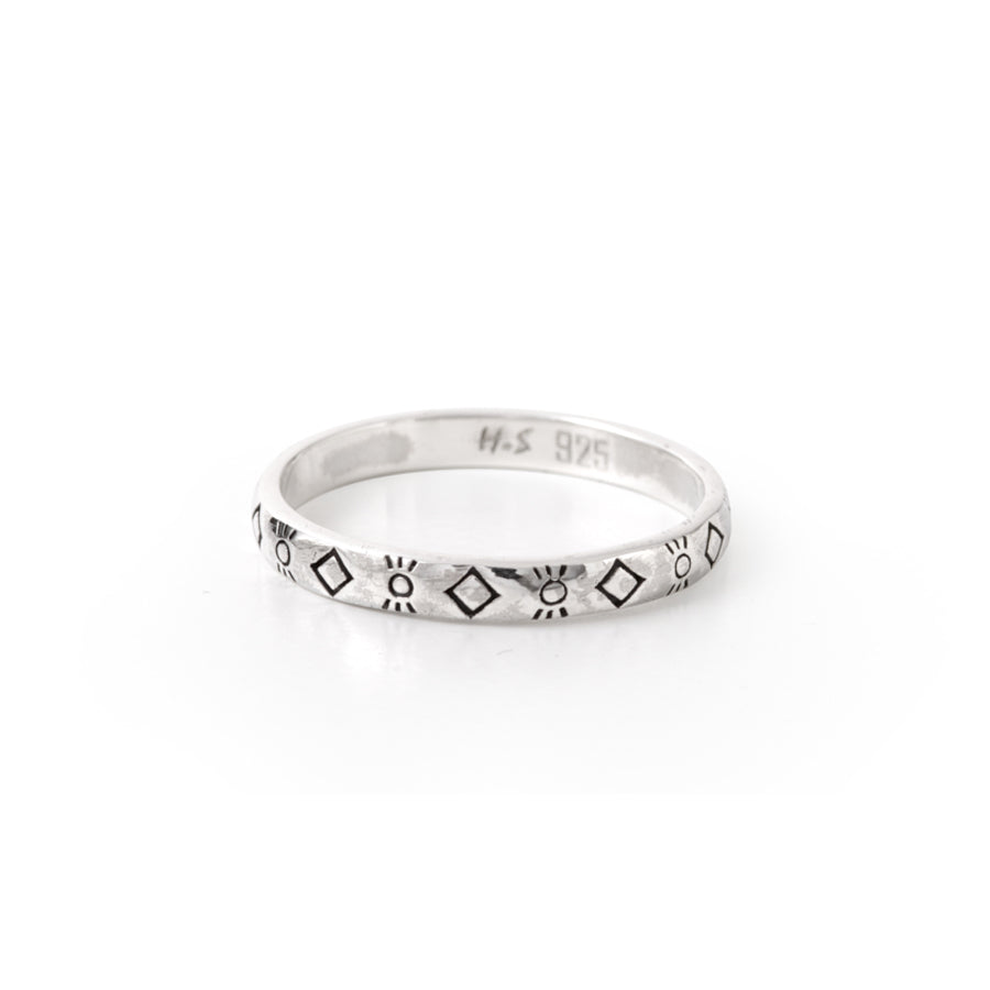 Anillo con dibujitos de estrellas y soles de aproximadamente 2mm de alto. Perfecto para llevar en "capas" combinado con más anillos de texturas i piedras pequeñas! También ideal para llevar solo en dedos pulgar/anular/meñique y así llenar esos huequitos de la mano dejando una mano perfectamente en armonía.