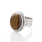 Anillo con piedra Ojo de tigre natural central en forma ovalada de aproximadamente 20 mm de alto. Trabajado en Plata de Ley oxidada, pátina oscura