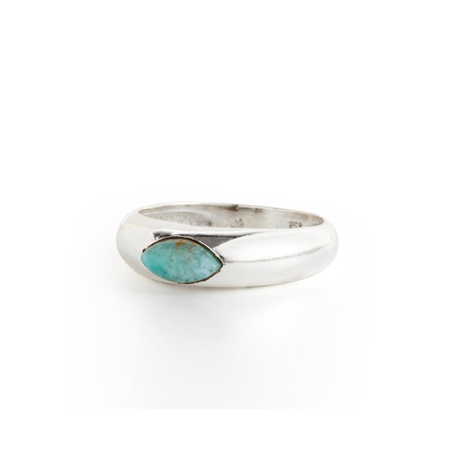 Anillo con piedra Larimar natural central de aproximadamente 0,5 mm de alto en Plata de Ley oxidada, pátina oscura que se le da a la plata 925 para crear un efecto envejecido que de profundidad al dibujo.