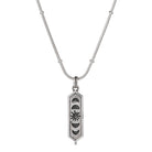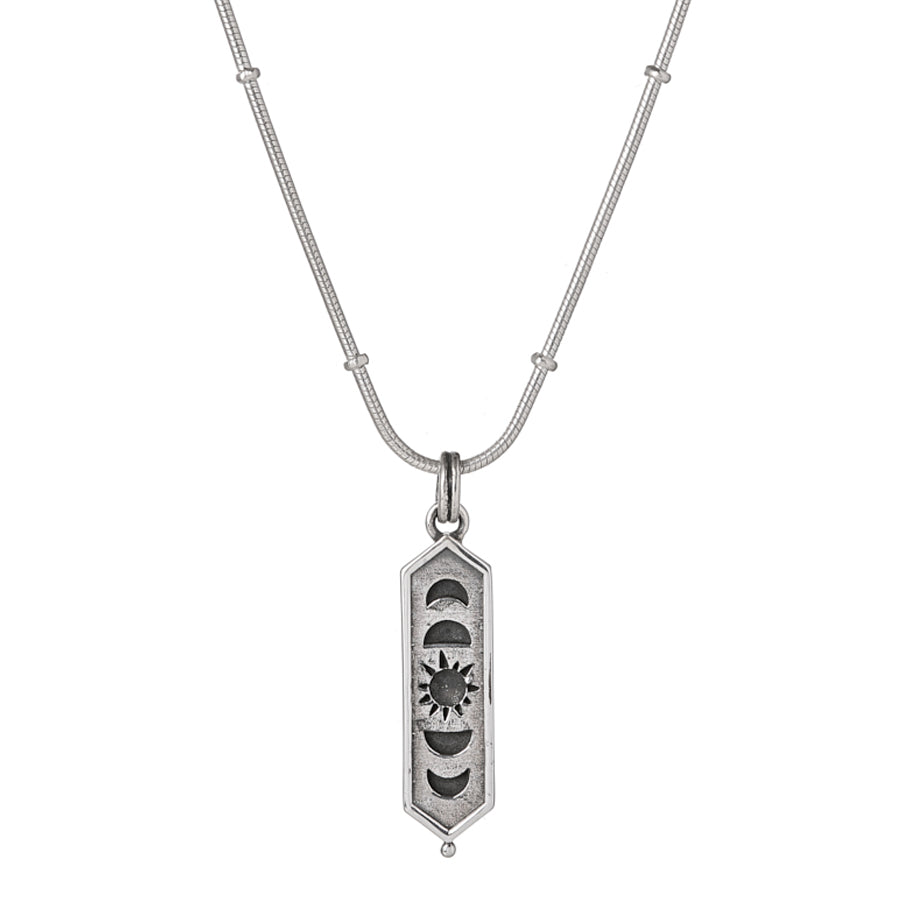 Cadena lisa tipo cola de ratón maciza con arandelas fijas y colgante alargado con fases lunares y sol central de aproximadamente 2,3 cm de alto. Elaborado en Plata de Ley 925 con acabado oxidado (pátina oscura que se le da a la plata para crear un efecto envejecido que de profundidad al dibujo).
