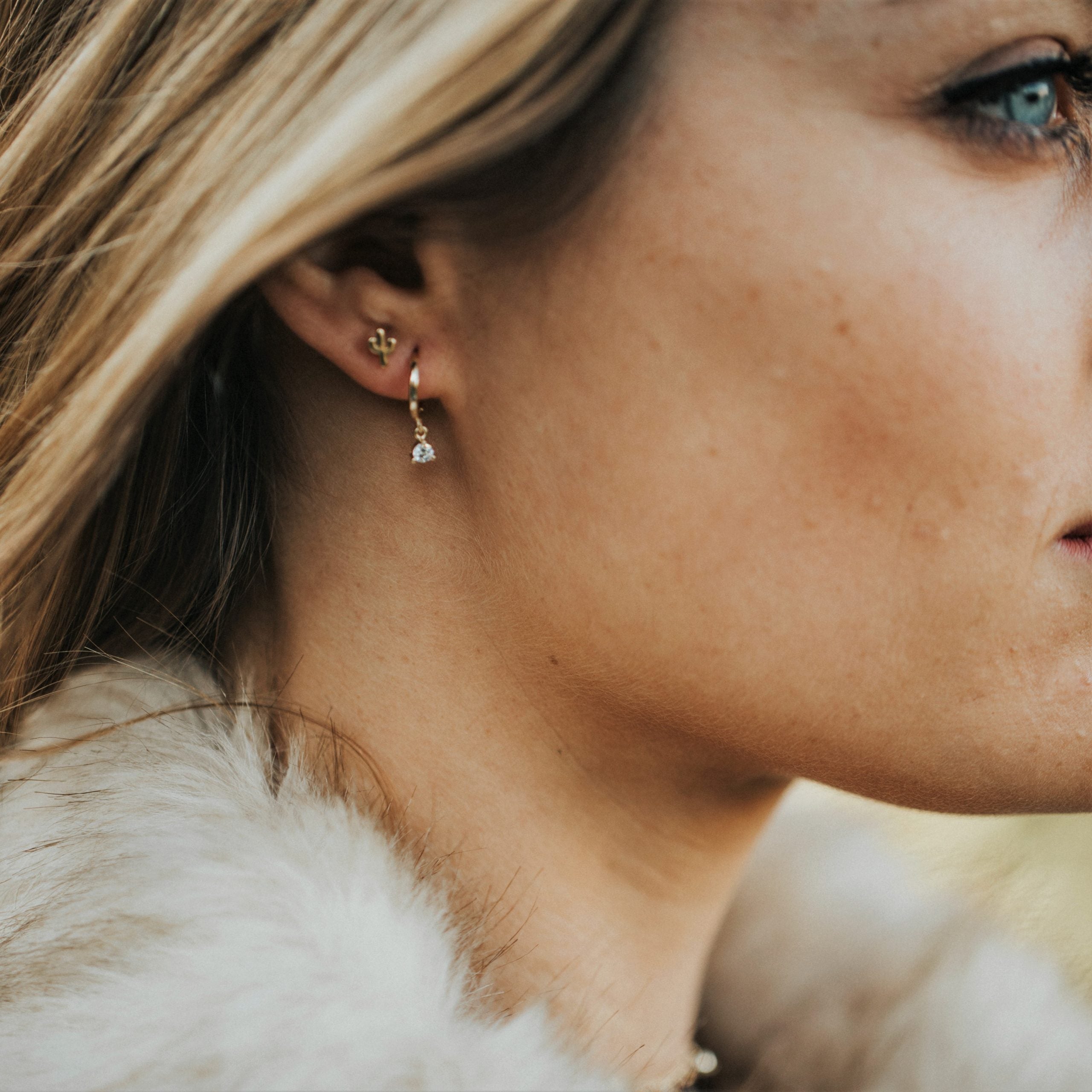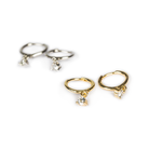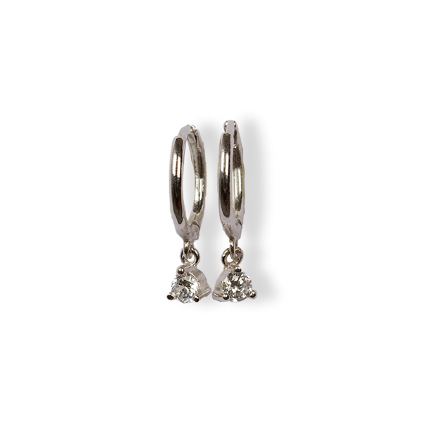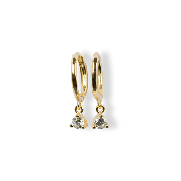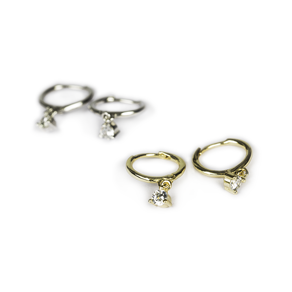 Pendientes tipo "aro" de 1 cm de diámetro. Circonita colgando de aproximadamente 3mm de diámetro. Material: PLATA DE LEY O PLATA DE LEY CHAPADA EN ORO DE 18/24K con 1 MICRA de espesor.