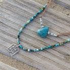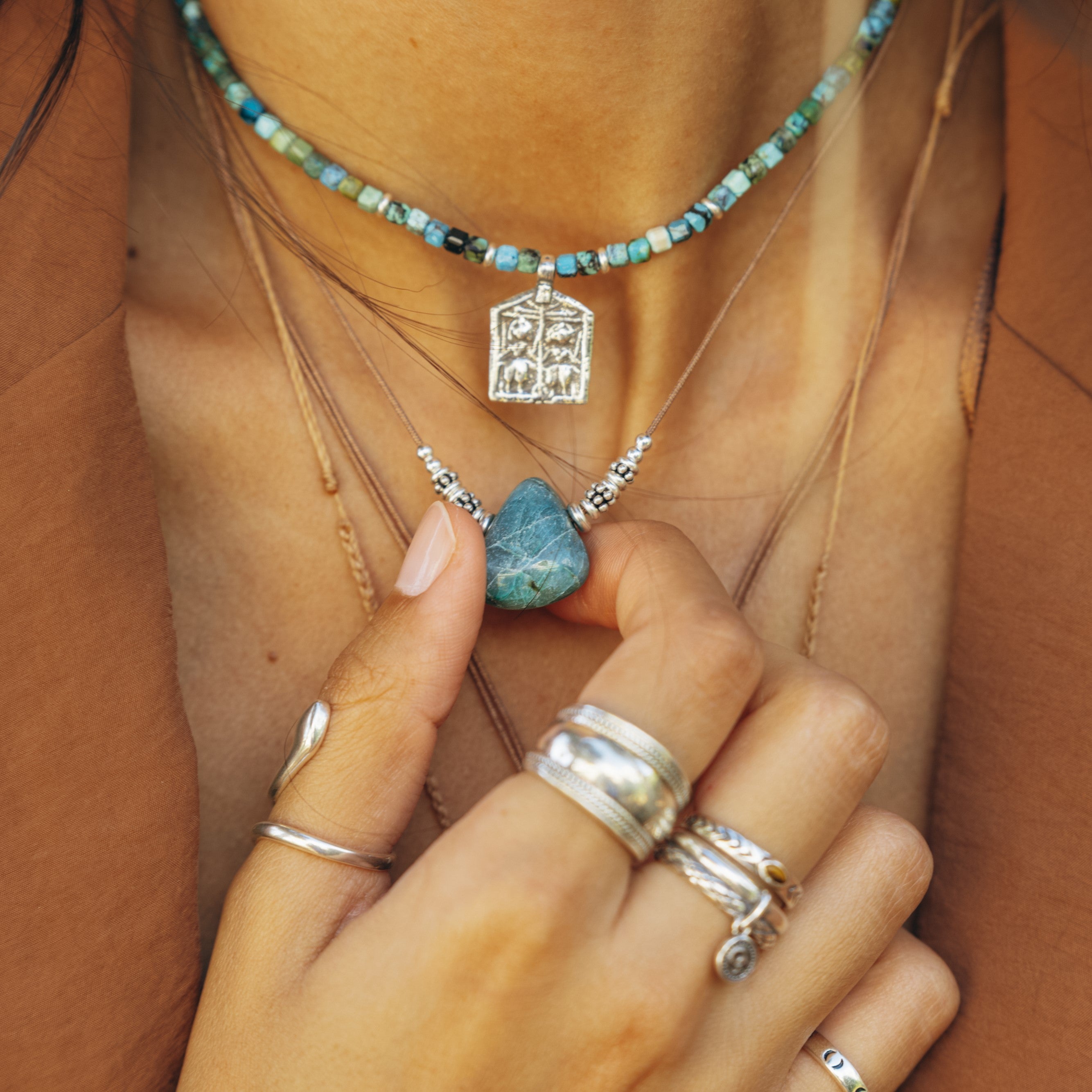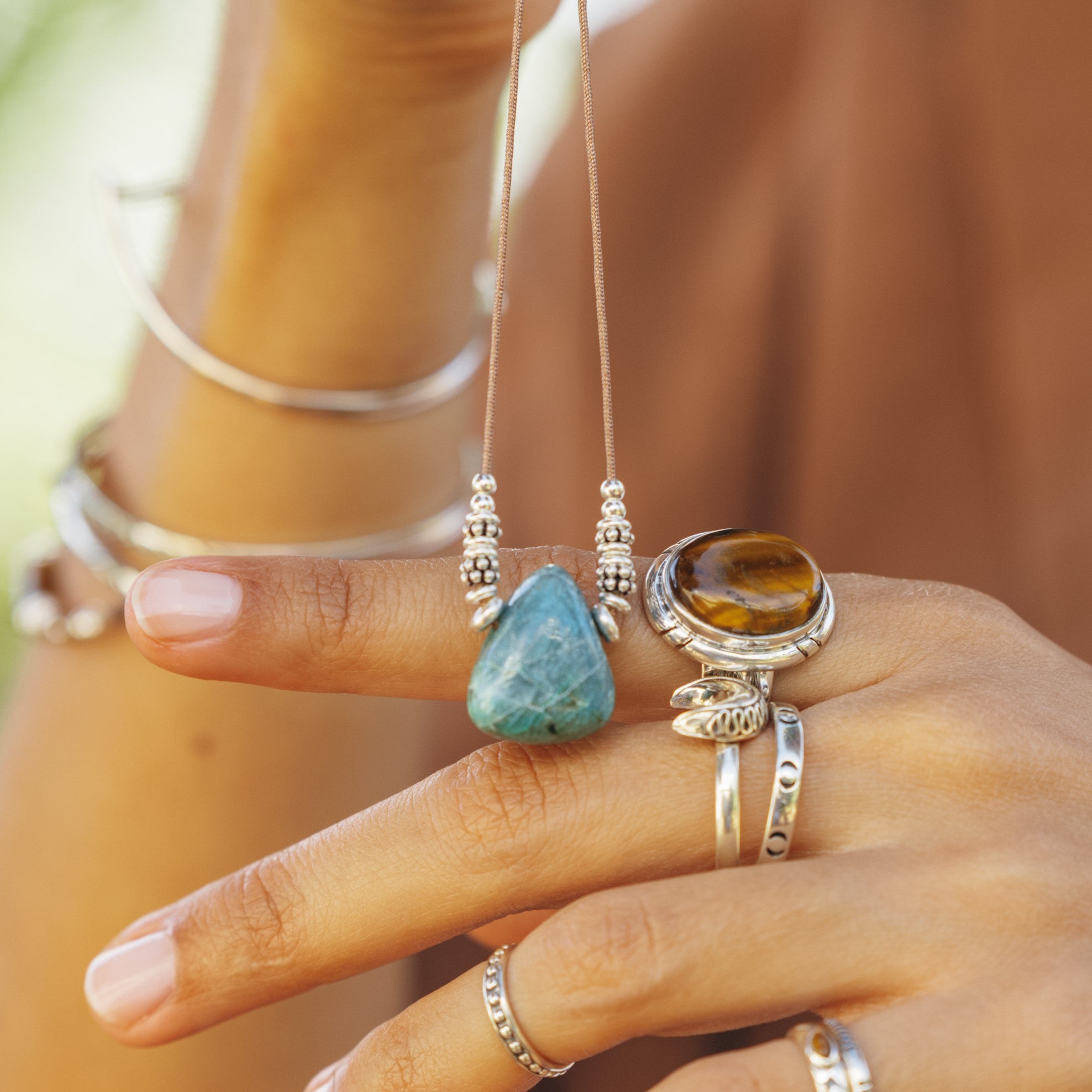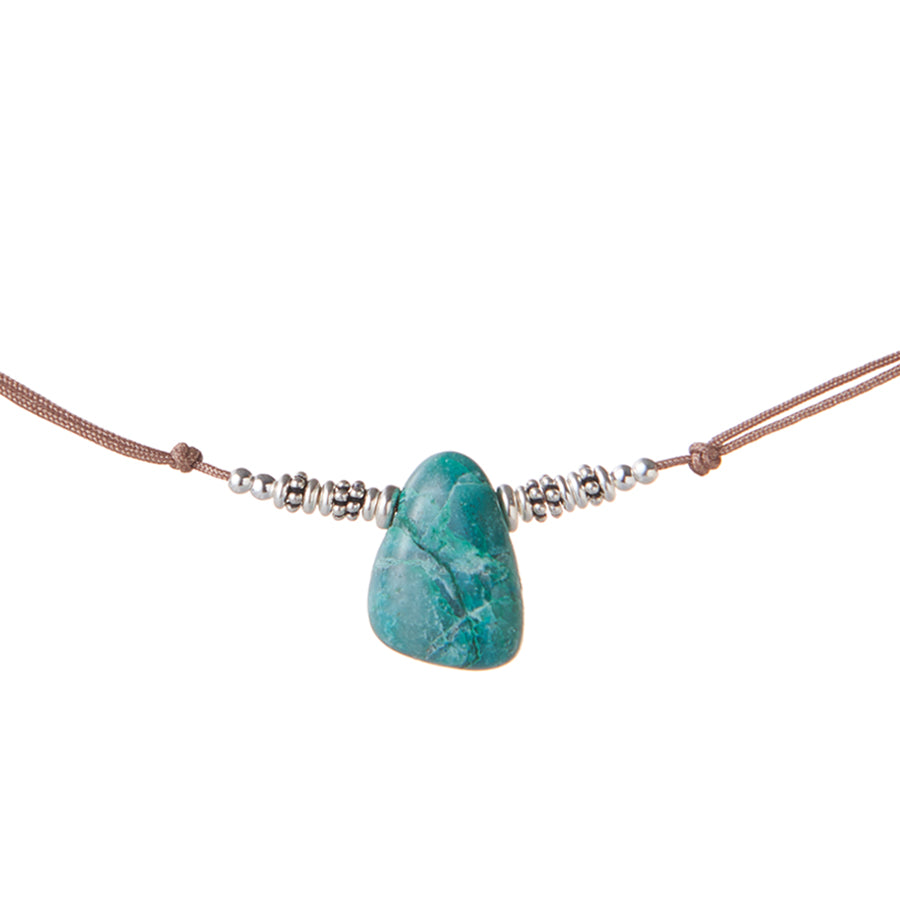 Collar de hilo ajustable hecho a mano con piedra Crisocola natural en forma de lágrima central y combinación de entre piezas en plata de ley.