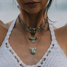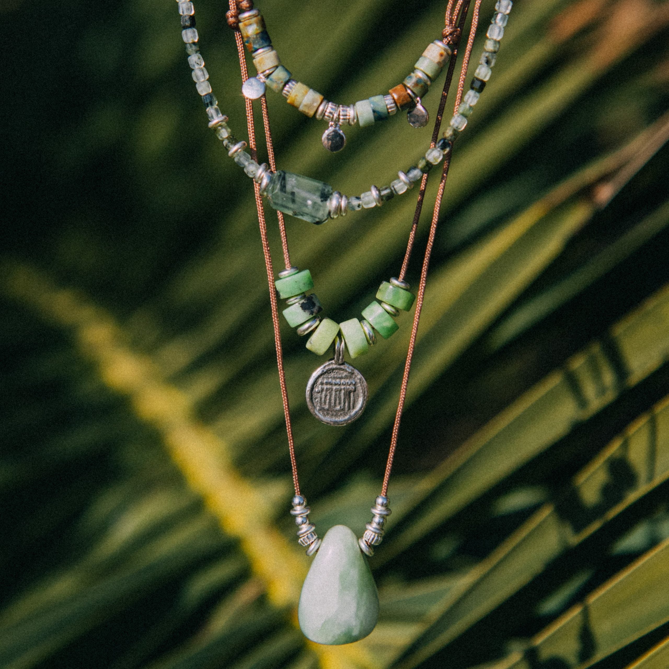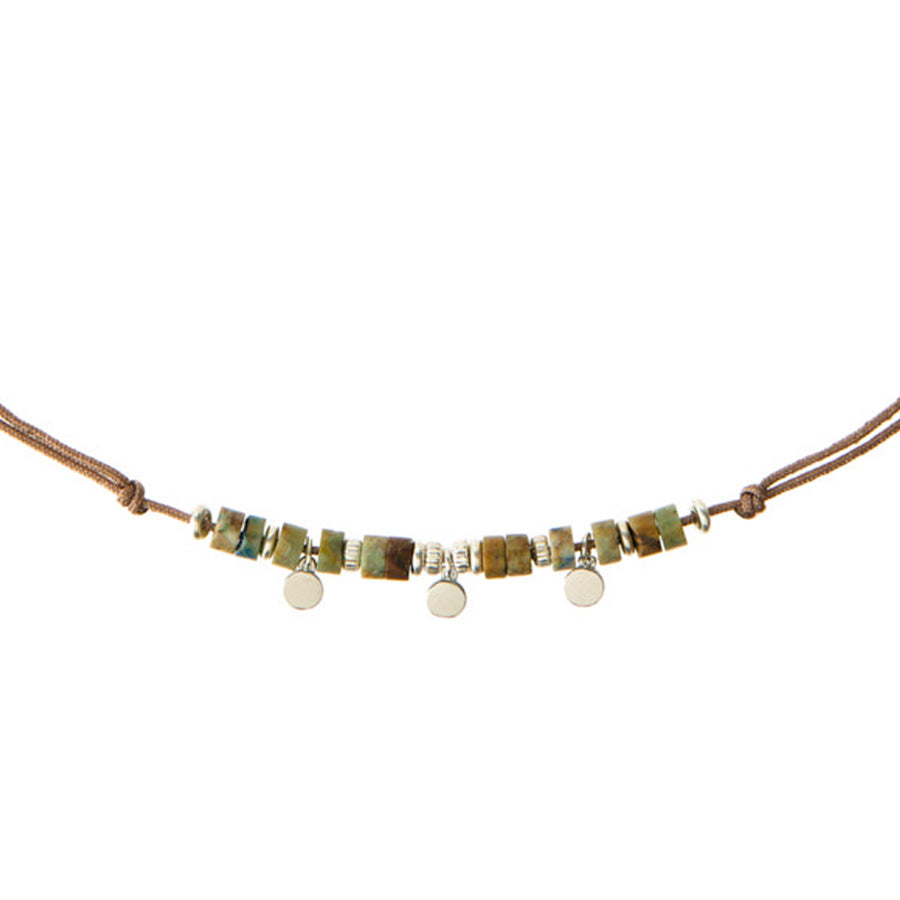 Collar de hilo ajustable hecho a mano con combinación de piedra Crisocola natural, y diferentes modelos de entre piezas y medallitas en Plata de Ley.