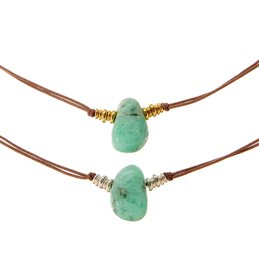 Collar de hilo ajustable hecho a mano con piedra Crisoprasa natural central en forma de lágrima y combinación de entre piezas en plata de ley ó plata de ley bañadas en oro.