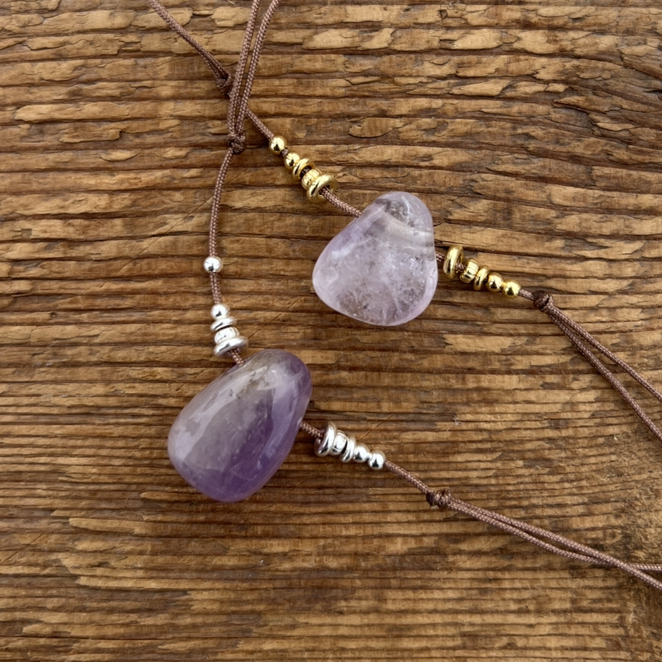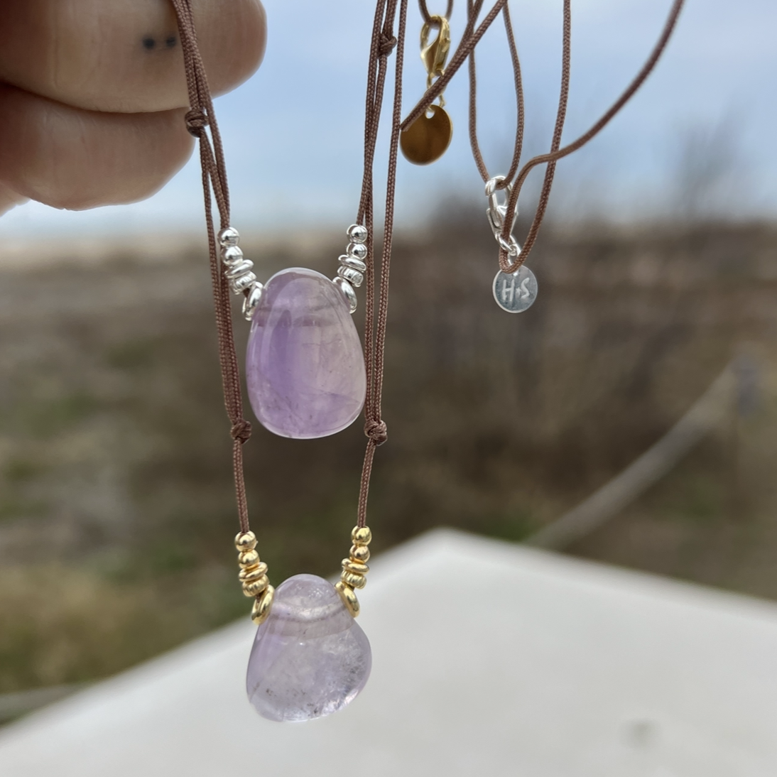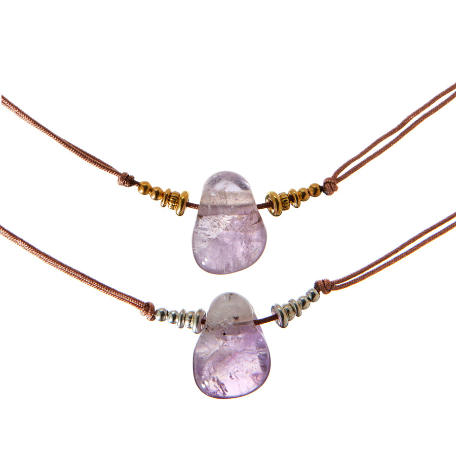Collar de hilo ajustable hecho a mano con piedra Amatista natural central en forma de lágrima y combinación de entre piezas en plata de ley ó plata de ley bañadas en oro.