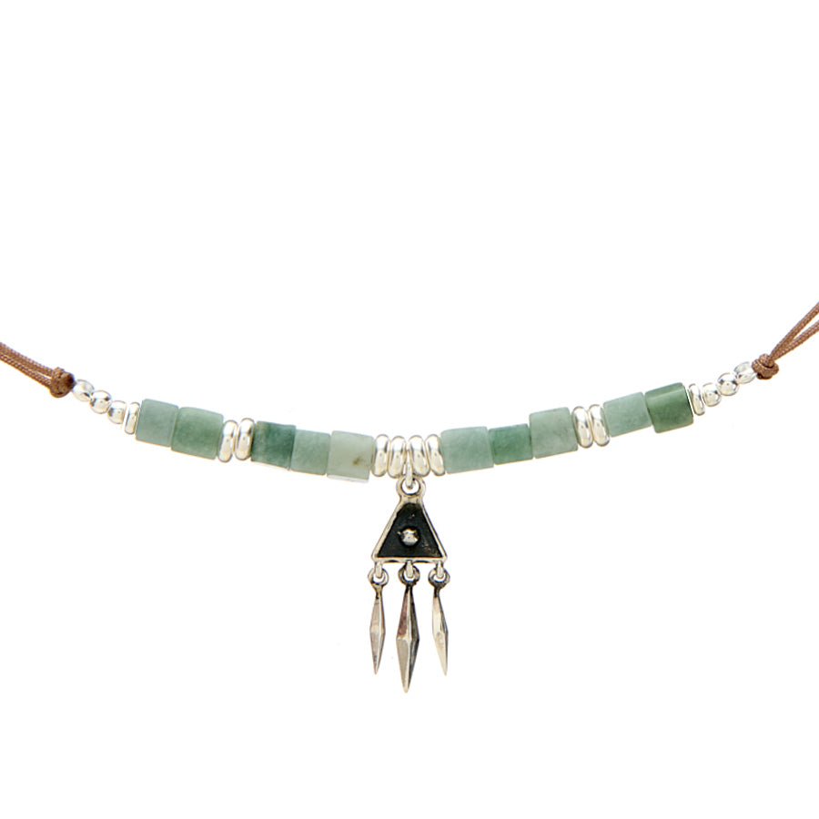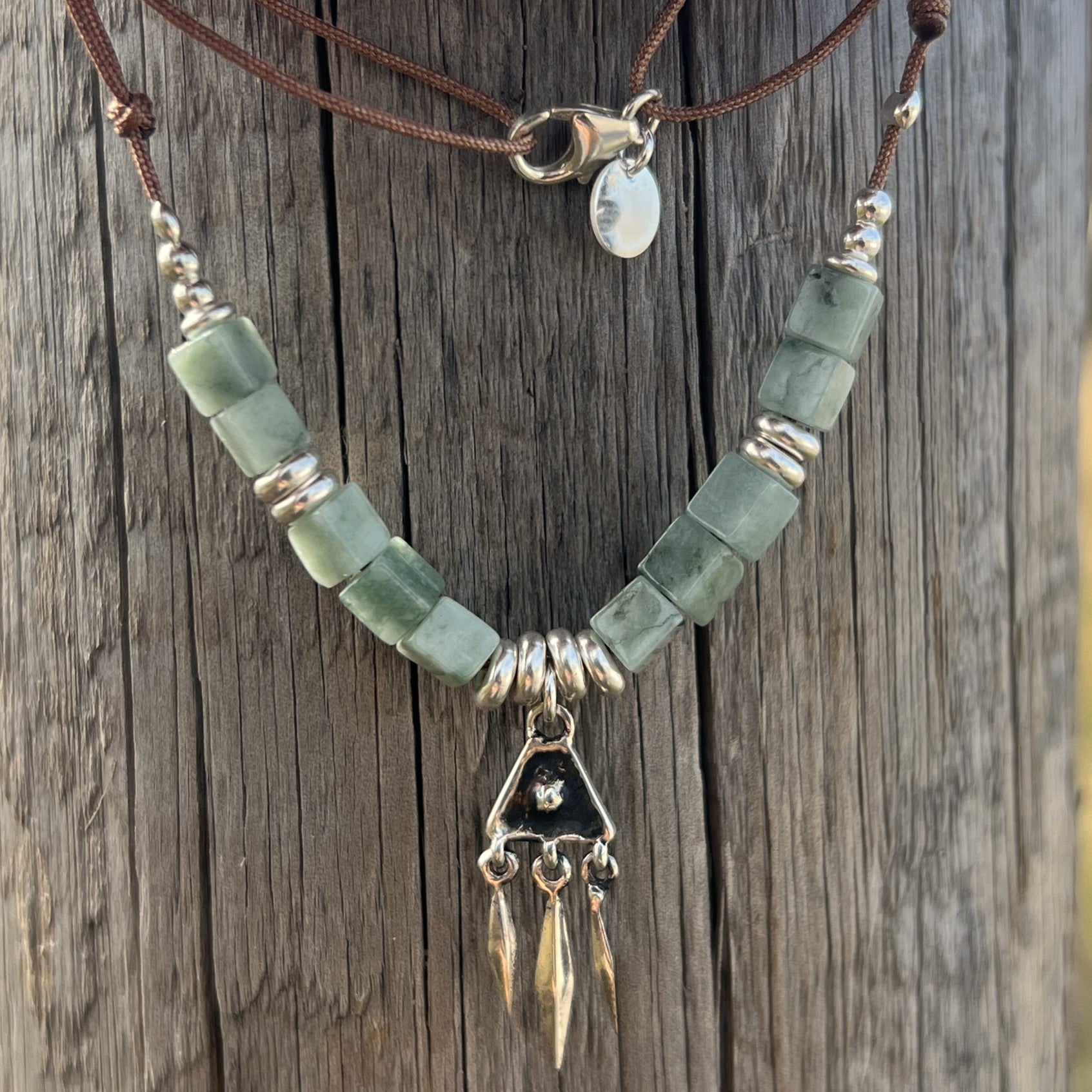 Collar de hilo ajustable hecho a mano con piedras Jade Burma natural, entre piezas y colgante central trabajados en Plata de Ley oxidada (pátina oscura que se le da a la plata para crear un efecto envejecido que de profundidad al dibujo).