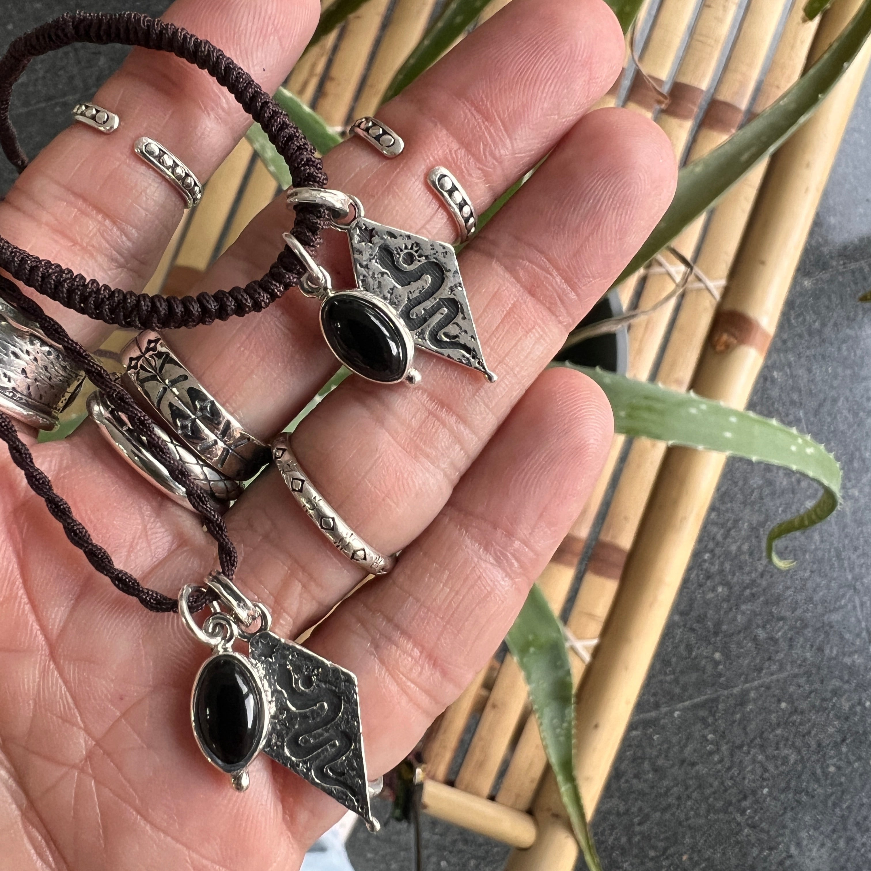 Choker trabajado a mano mediante técnica de macramé con combinación de dos colgantes centrales, el principal diseñado en forma de rombo y dibujo de serpiente acompañado con colgante en piedra Ónix negro. La pieza entera está elaborada en Plata de Ley 925 oxidada, pátina oscura que se le da a la plata para crear un efecto envejecido que de profundidad al dibujo.
