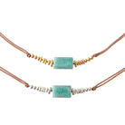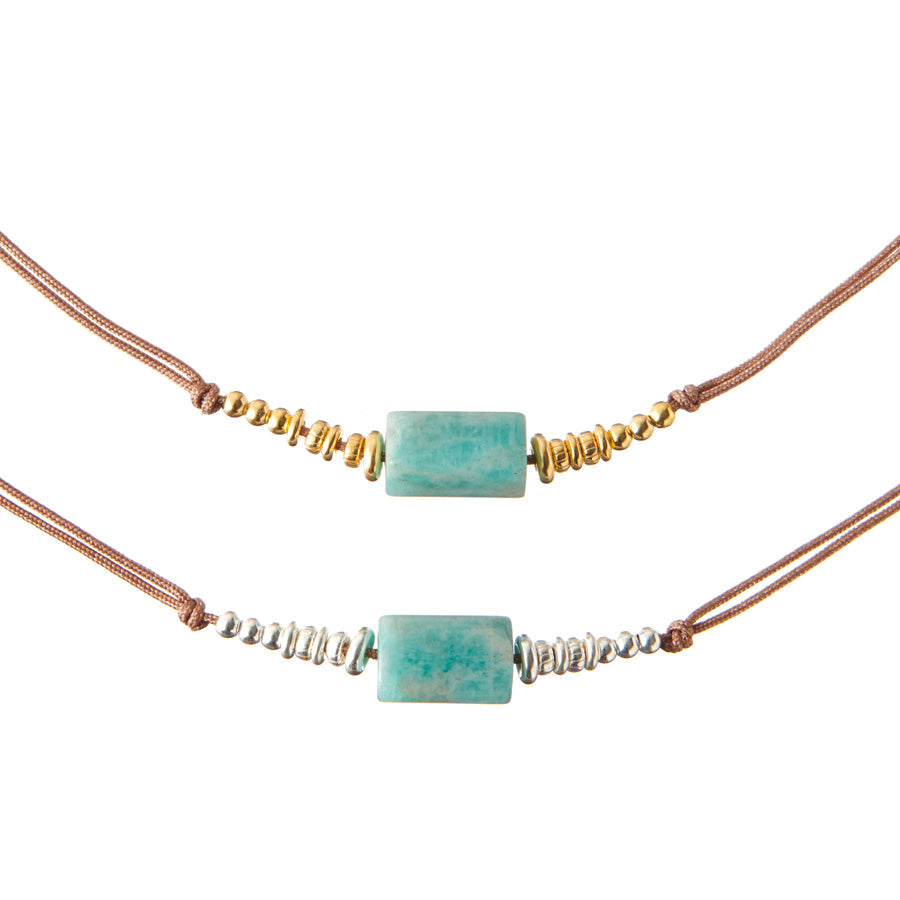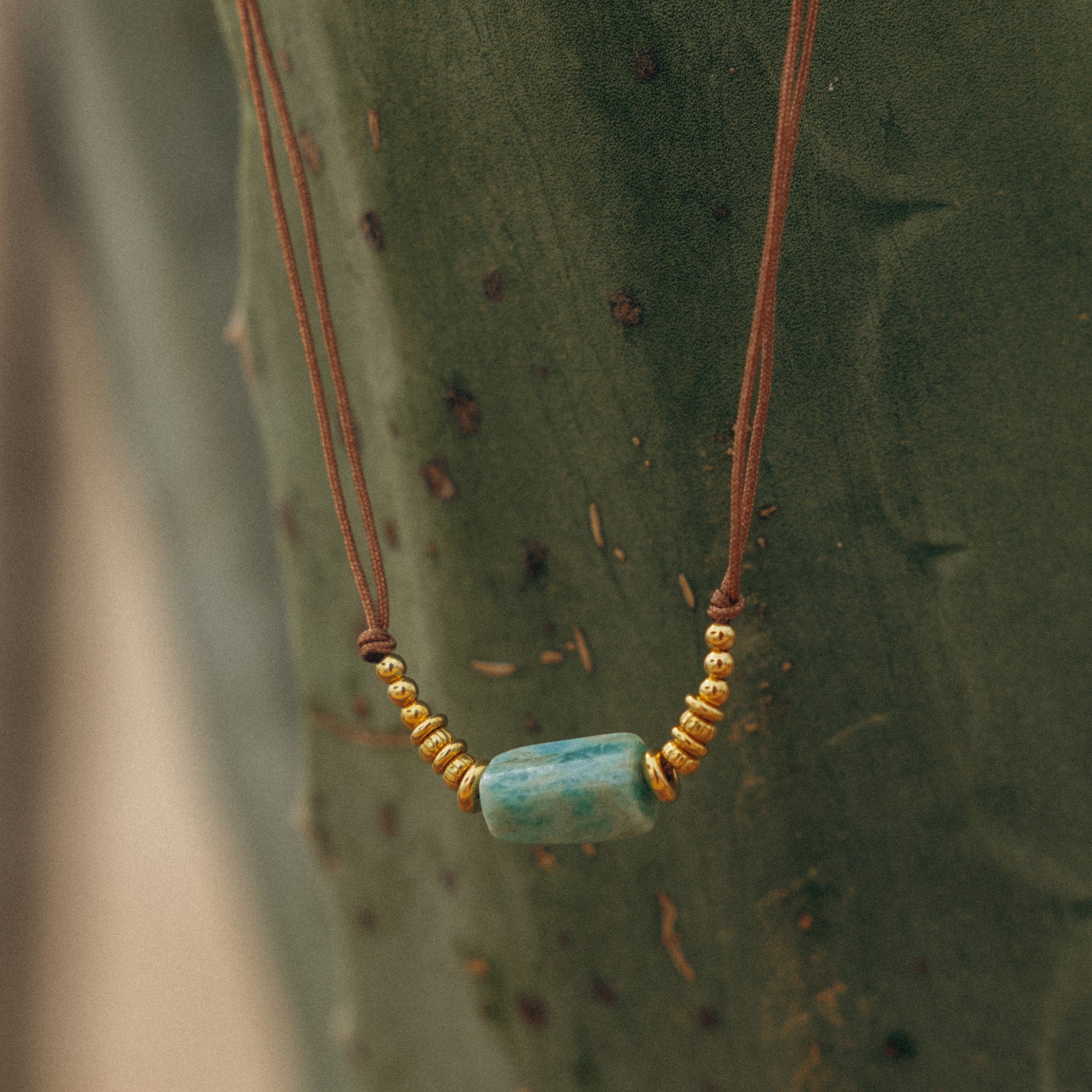 Collar de hilo ajustable hecho a mano con piedra Amazonita central en forma de tubo y combinación de entre piezas en plata de ley bañadas en oro.