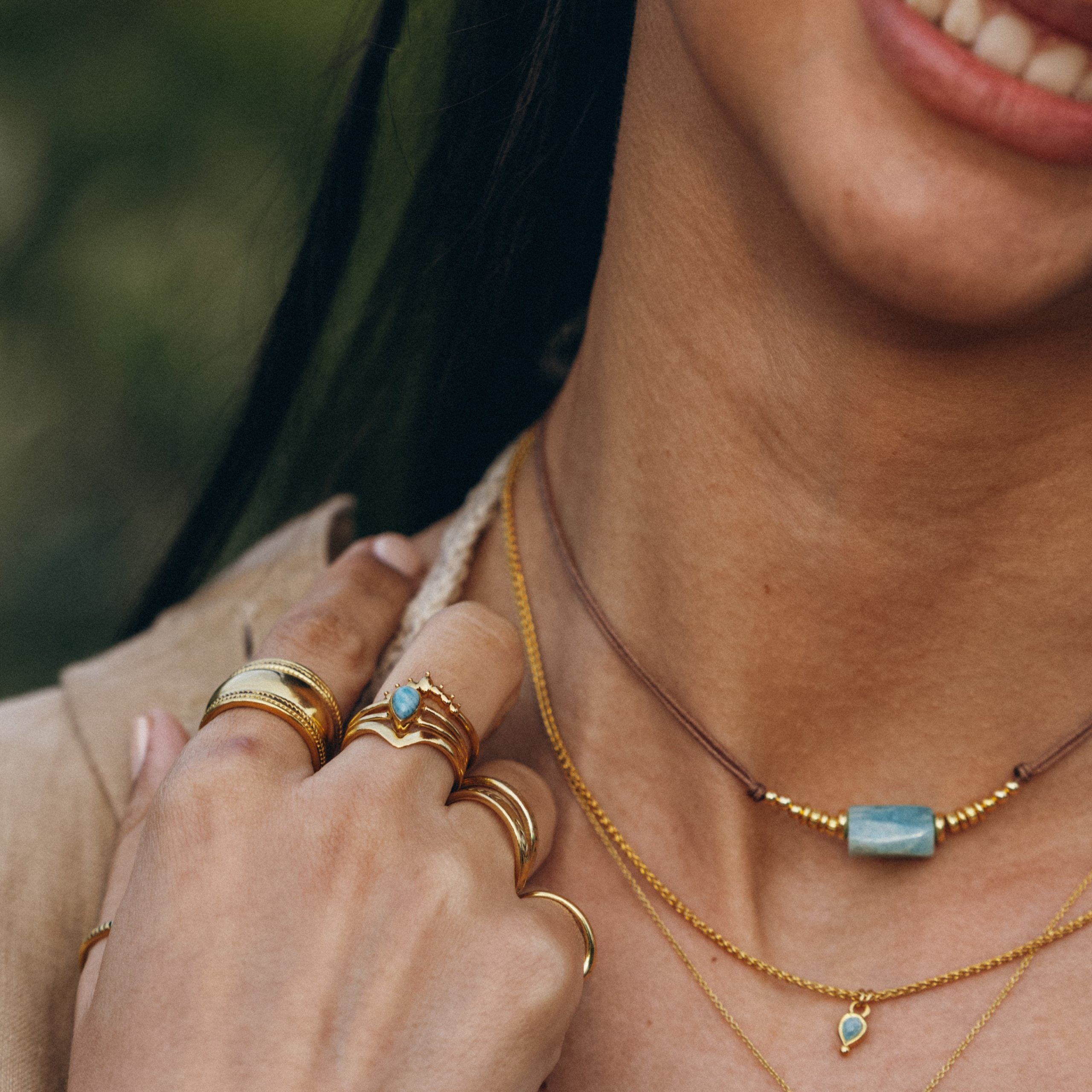 - Entre piezas en Plata de Ley bañadas en oro y piedra Amazonita natural.