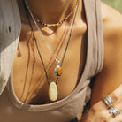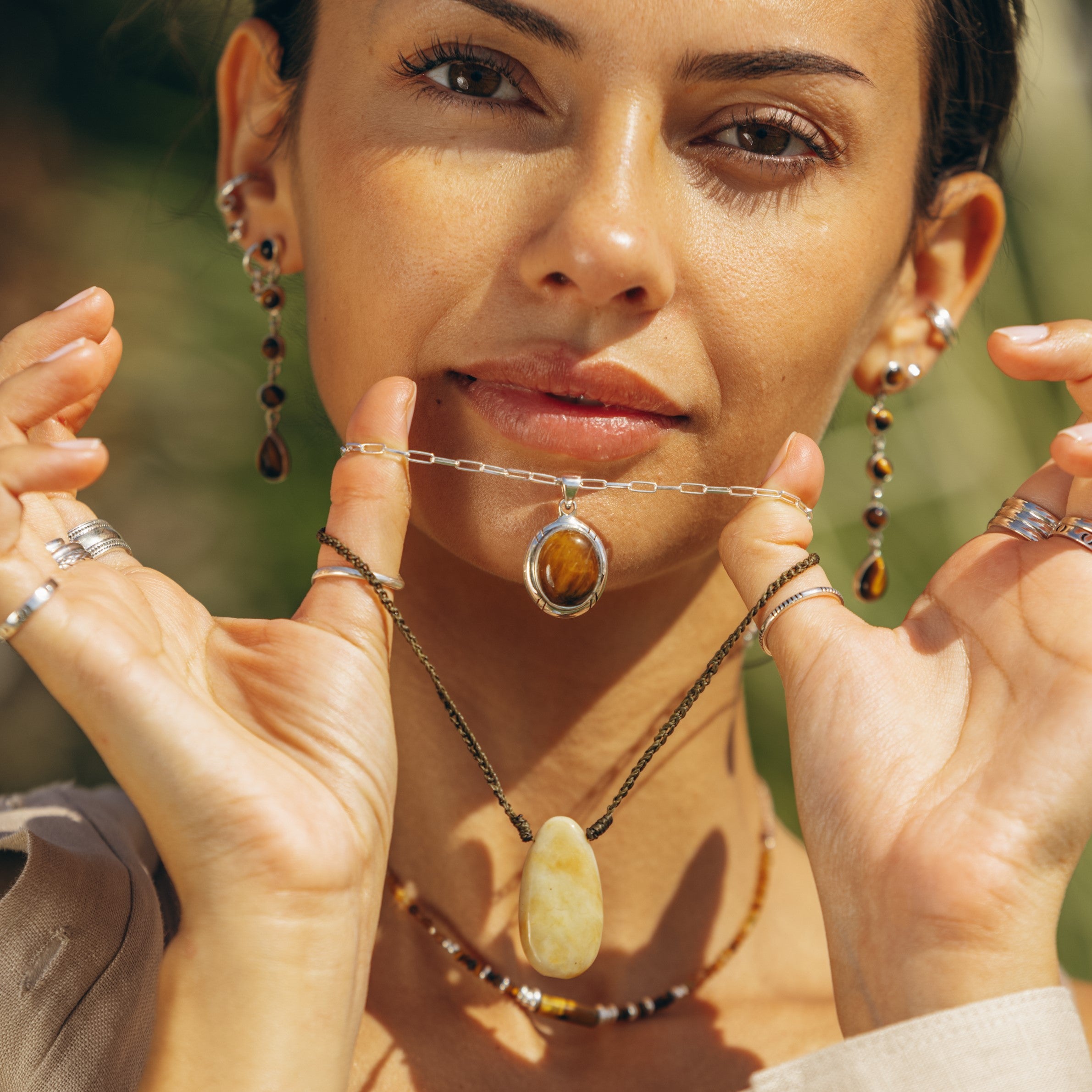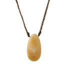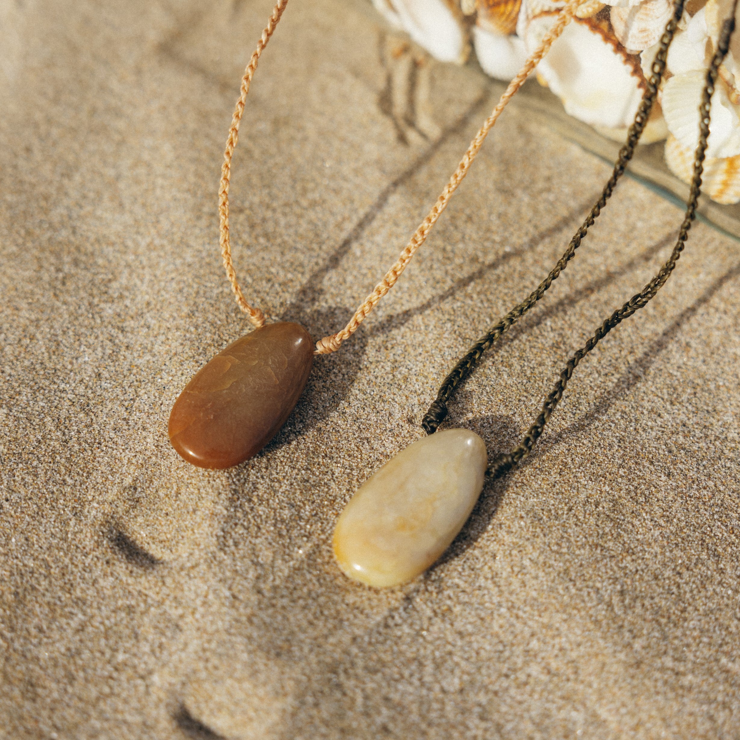 Collar de edición limitada trabajado a mano con hilo color marrón oscuro encerado con técnica de macramé, con pieza central en piedra Ópalo amarillo natural de aproximadamente 30 mm de alto. Los cortes de piedra escogidos para este modelo son los cortes más claritos.