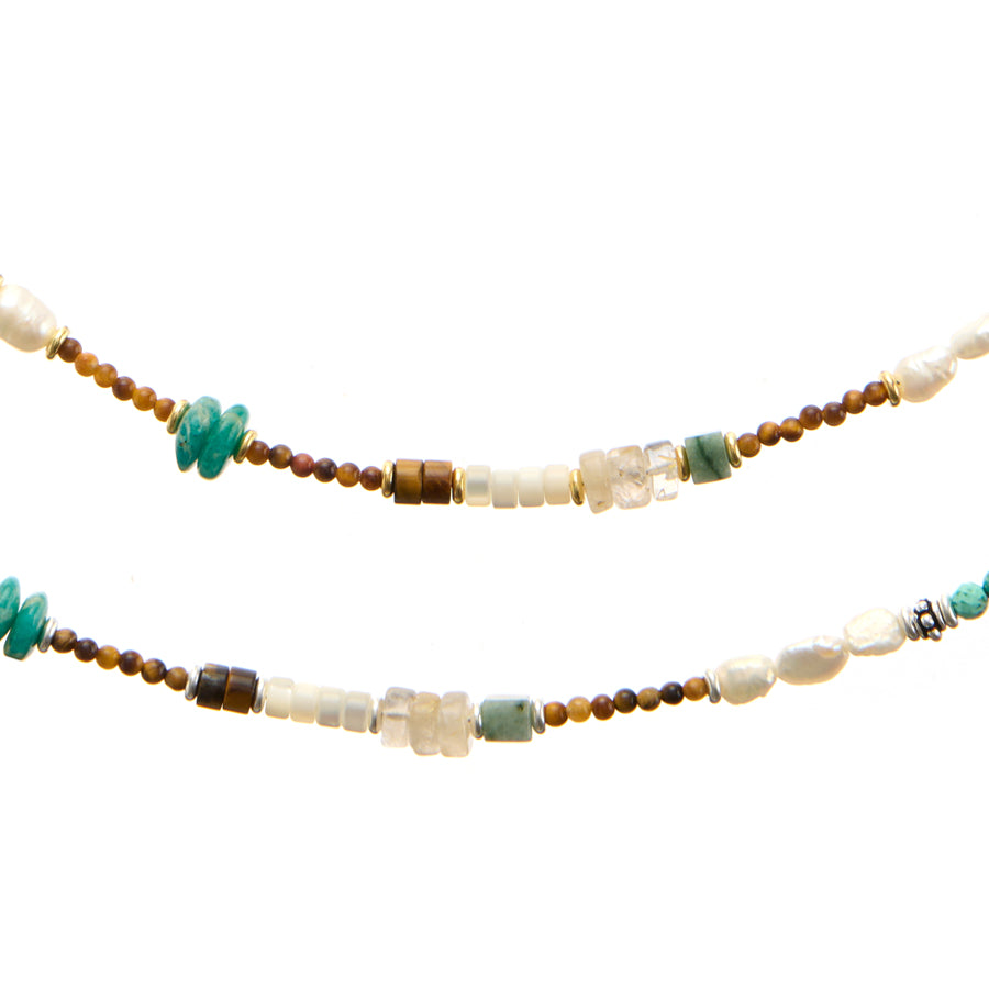 Gargantilla entera de piedrecitas hecha a mano y diseñada con combinación de variedad de piedras (Ojo de Tigre, Nácar, Perlas, Amazonita, Jade Burma, Turquesa, Cuarzo rutilado) y entre piezas en Plata de ley o en Plata de ley chapadas en oro.