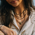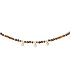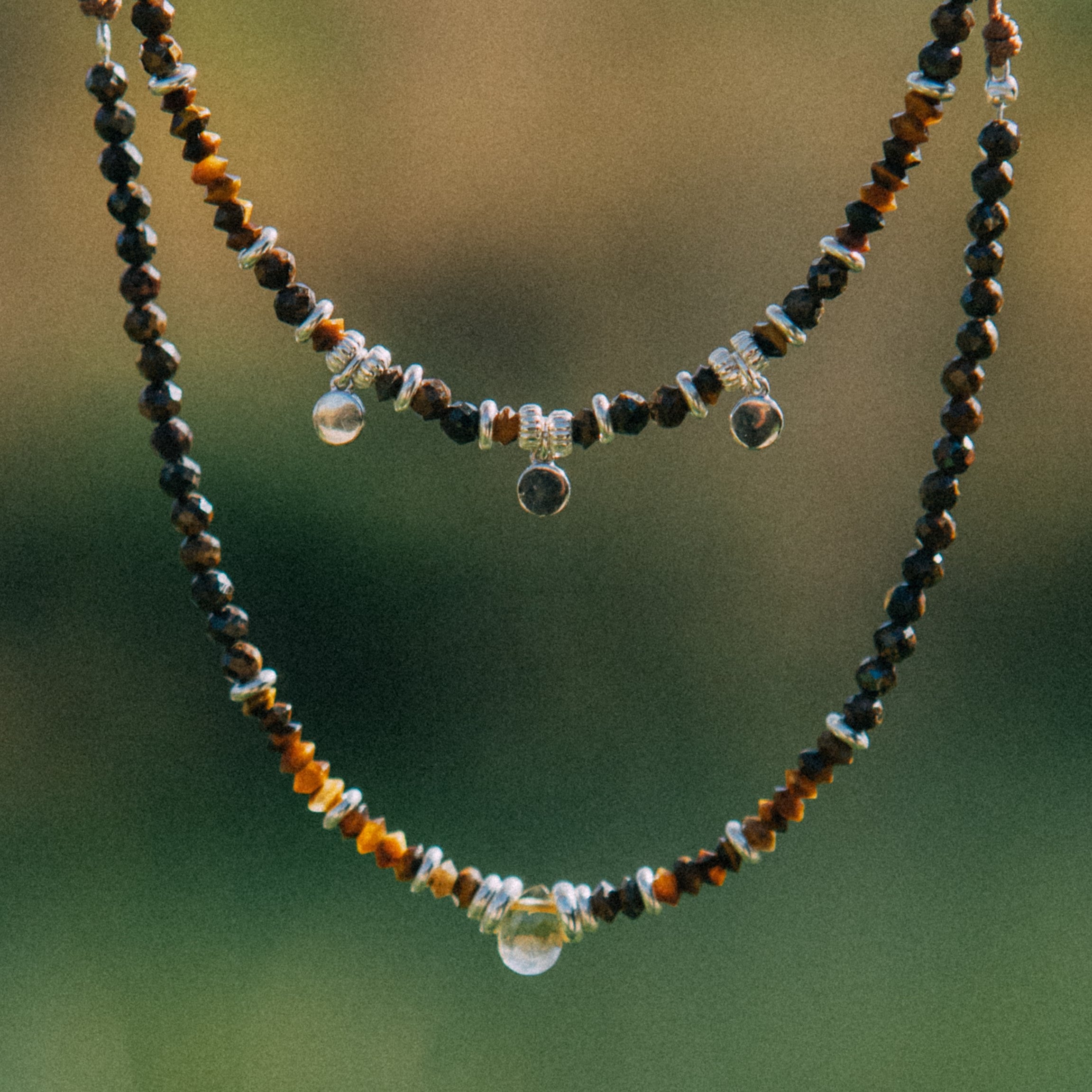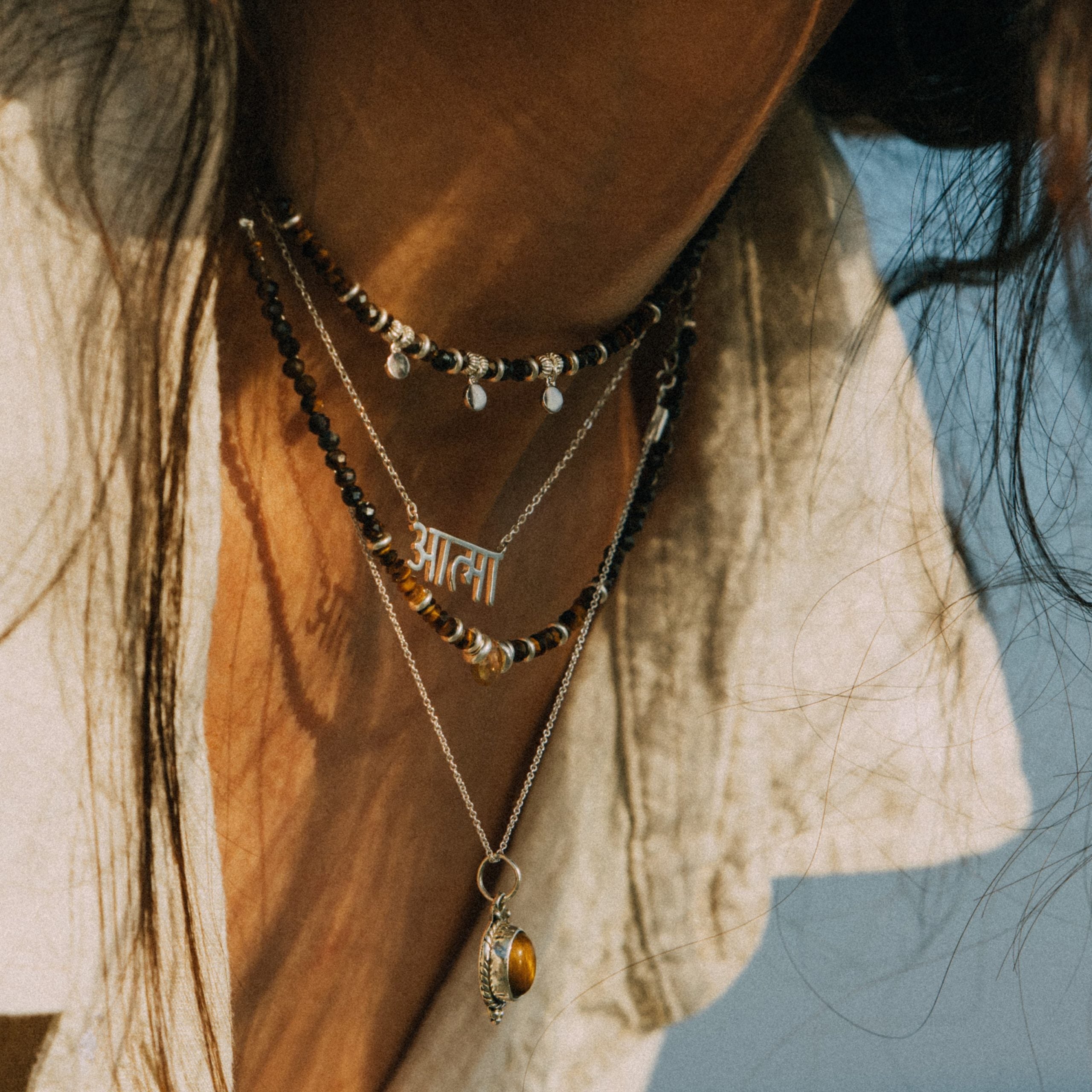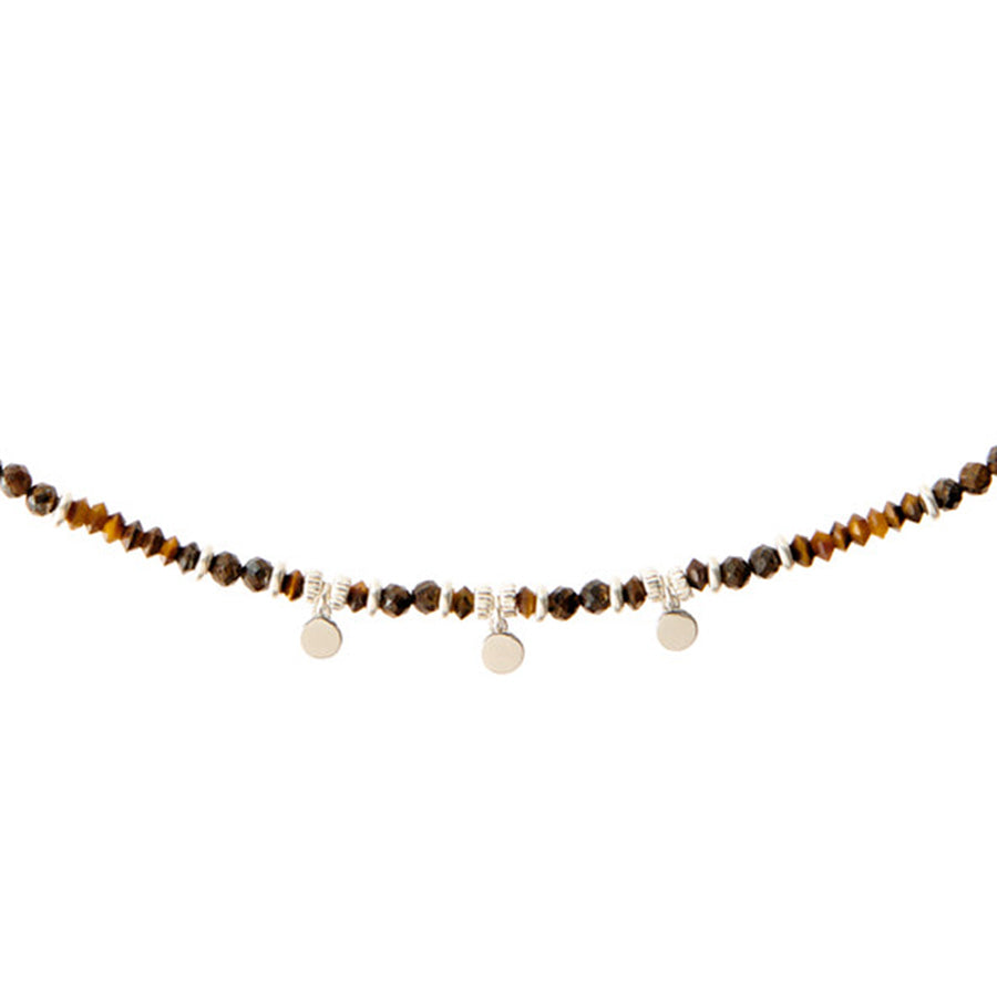 Gargantilla hecha a mano con combinación de piedras Broncita y Ojo de Tigre naturales, diferentes tipos de entre piezas en plata de ley, y tres medallitas lisas centrales.