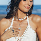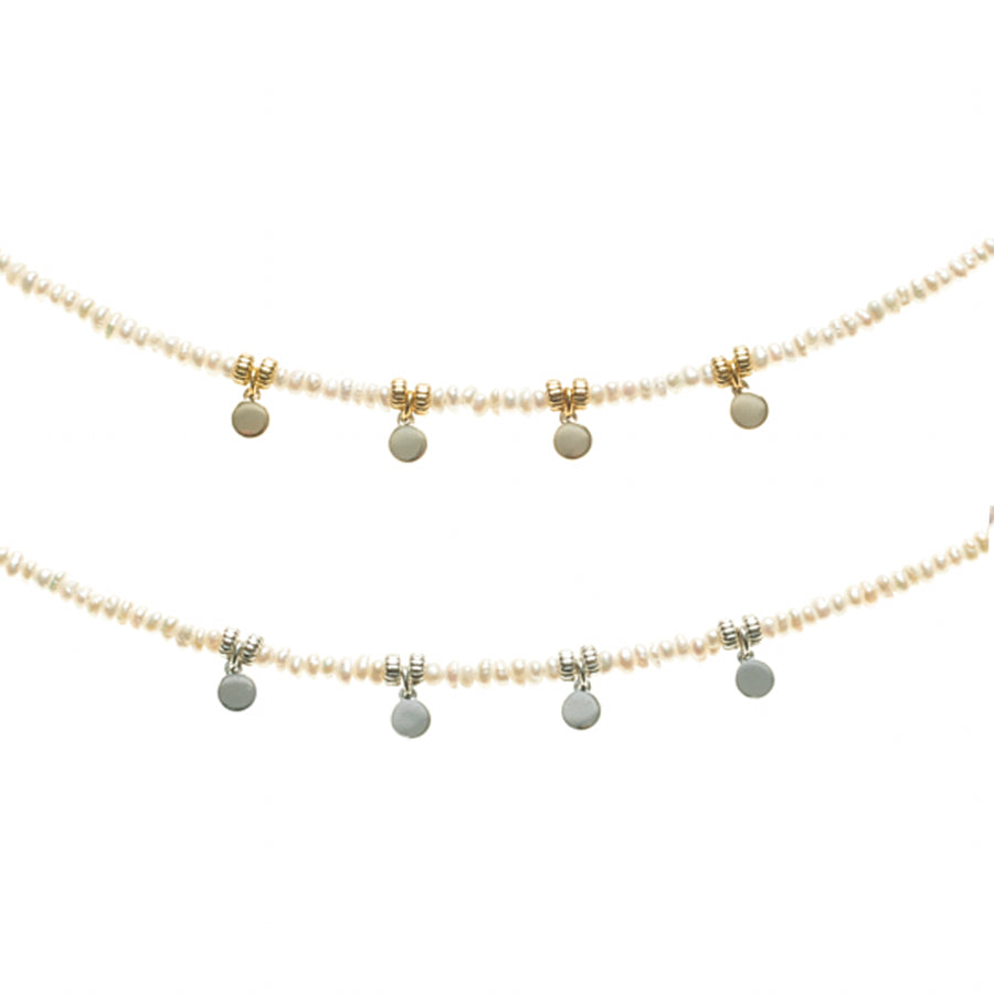 Gargantilla ajustable hecha a mano, con perlas naturales y entrepiezas en Plata de Ley. Largo ajustable. Disponible en Plata y Oro.
