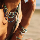Largo ajustable, con terminación en hilo y nudo corredizo a lado y lado de la parte central de piedrecitas.