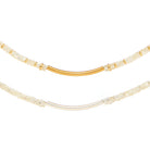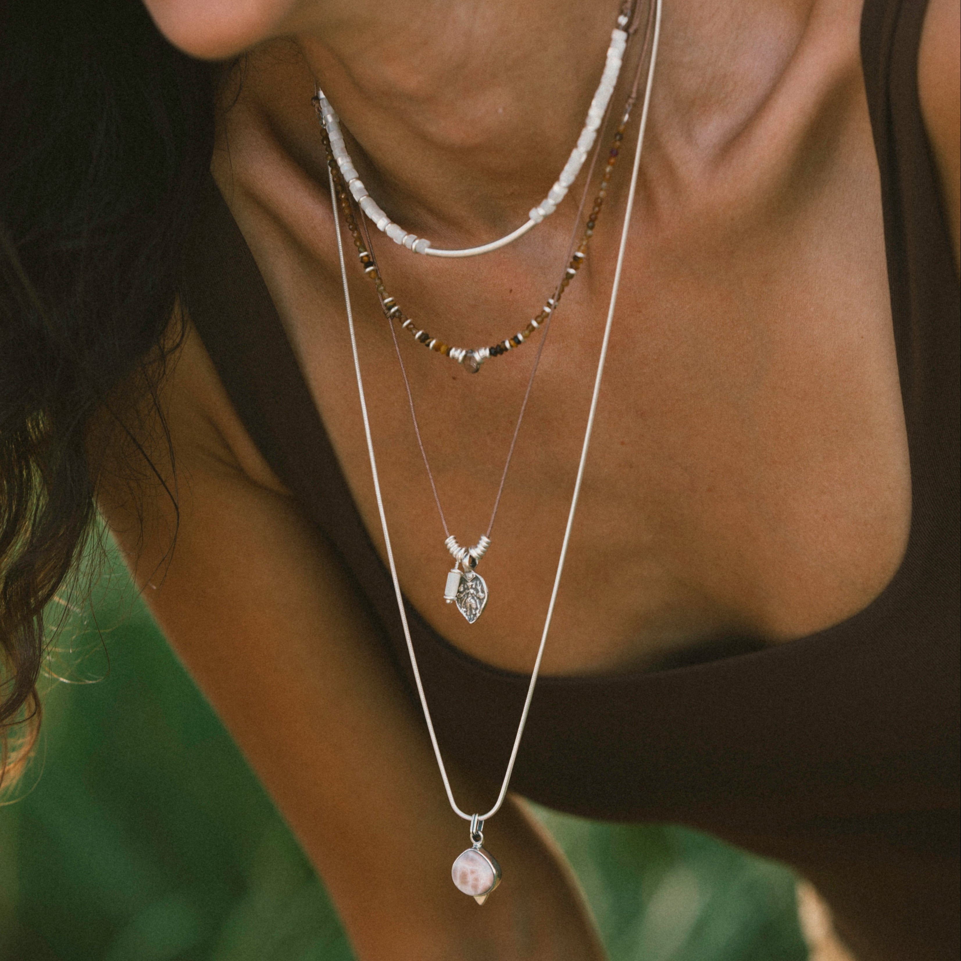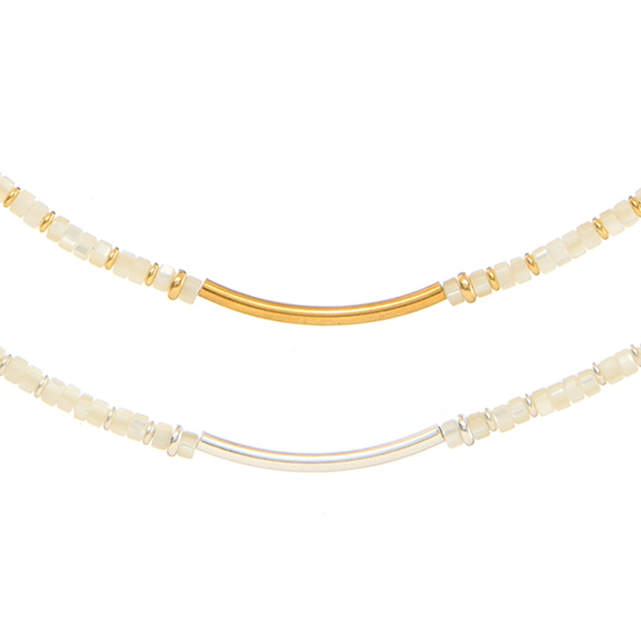 Gargantilla hecha a mano con piedras Nácar, entre piezas en plata de ley y pieza central con forma de tubo en plata de ley ó en plata de ley chapada en oro.
