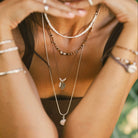 Largo ajustable, con terminación en hilo y nudo corredizo a lado y lado de la parte central de piedrecitas. Este tipo de collar puede llevarse cortito o largo dependiendo de con que otros collares lo combines!