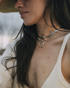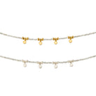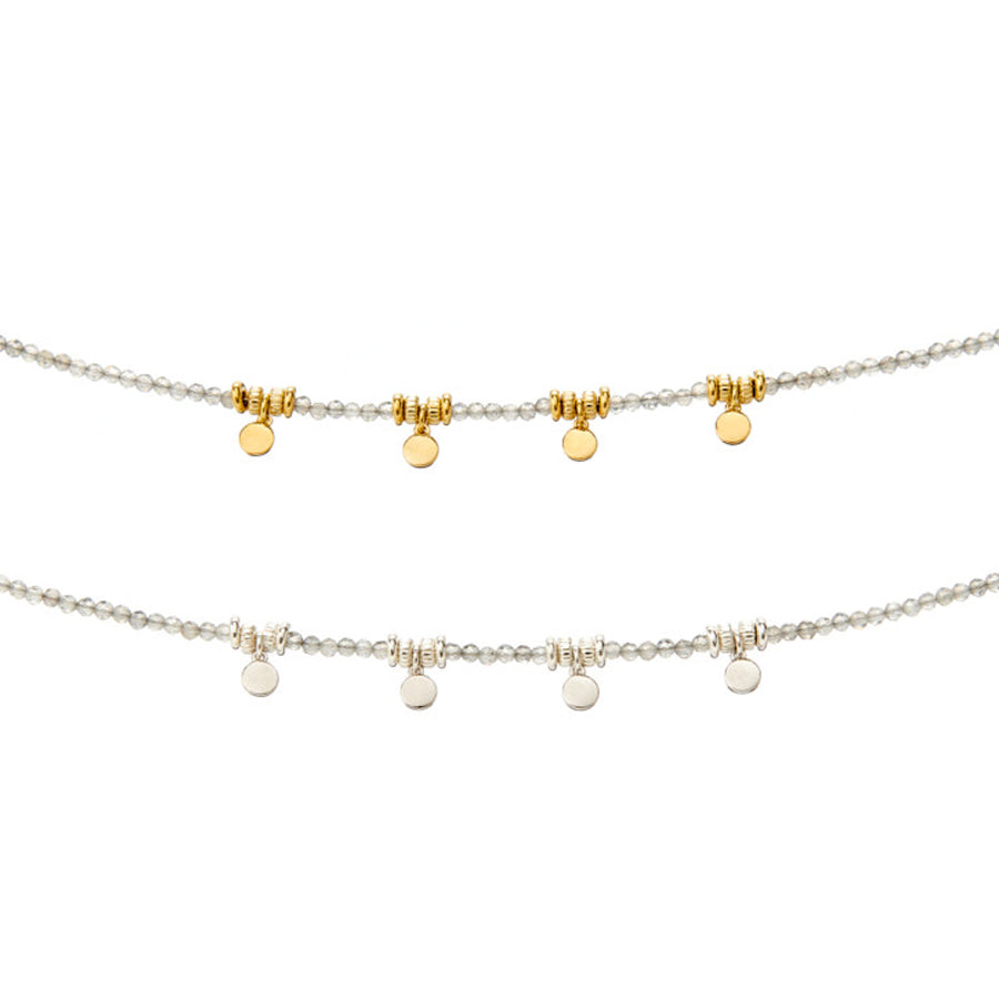 Gargantilla ajustable hecha a mano, con piedras Labradorita naturales y entrepiezas/medallitas en plata. Largo ajustable, gargantilla terminada con hilo ajustable a lado y lado de las piedrecitas. Material: Disponible en Plata de Ley ó Plata de Ley chapada en oro de 18/24k.