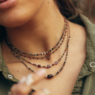 Largo ajustable, con terminación en hilo y nudo corredizo a lado y lado de la parte central de piedrecitas.