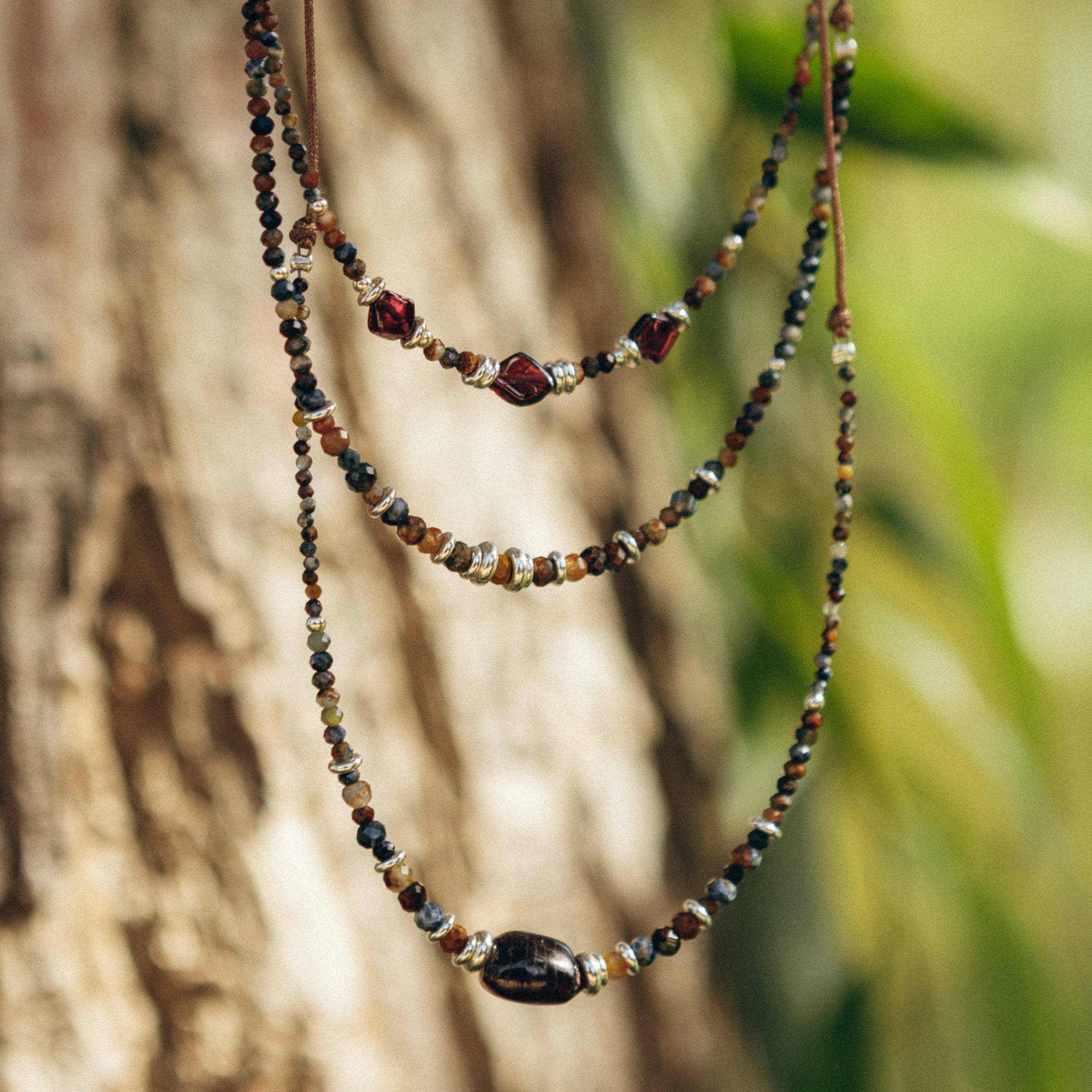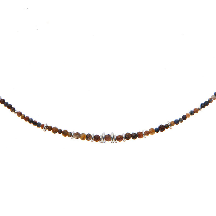 Gargantilla hecha a mano con piedras Pietersita de distintos tamaños y combinación de entre piezas en plata de ley.