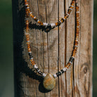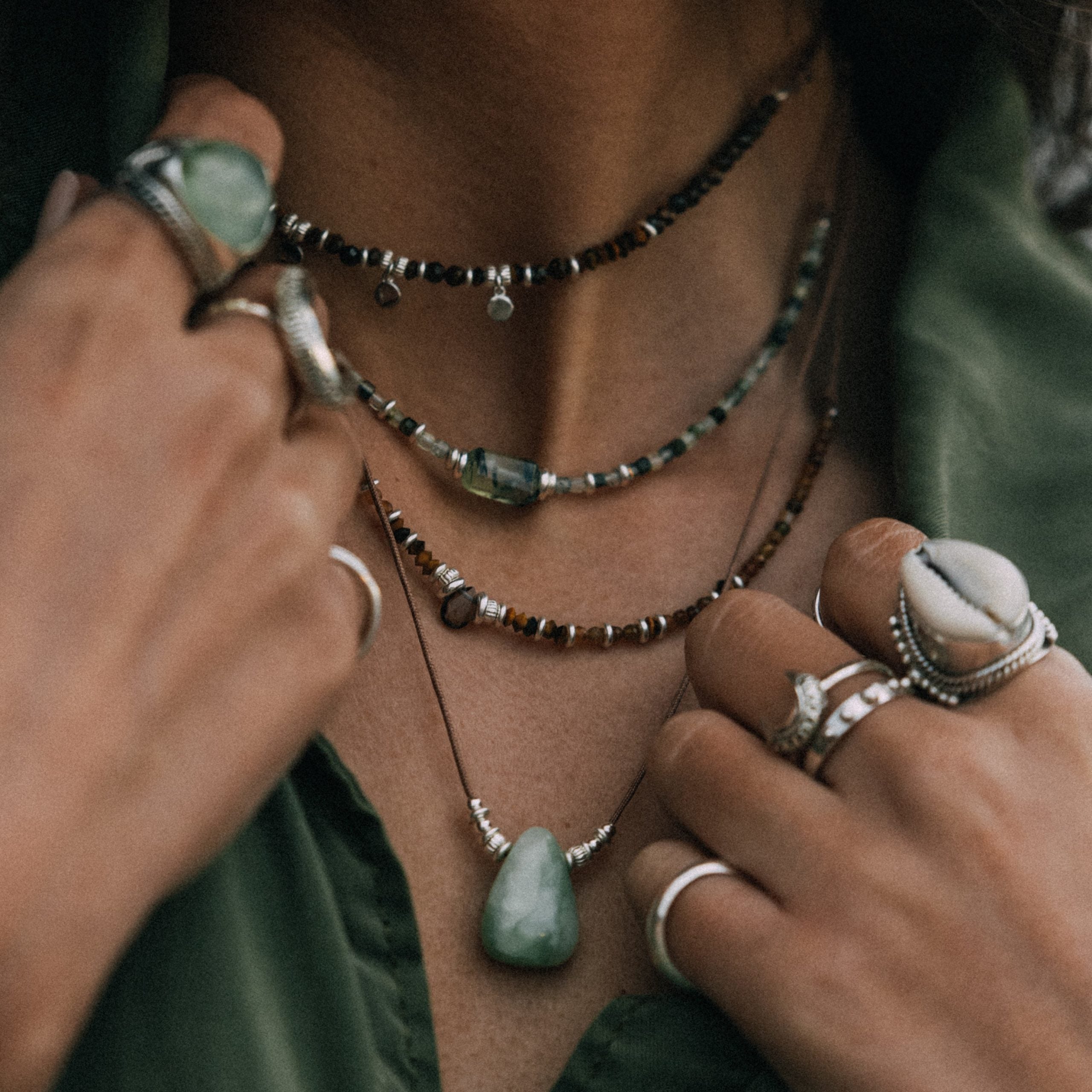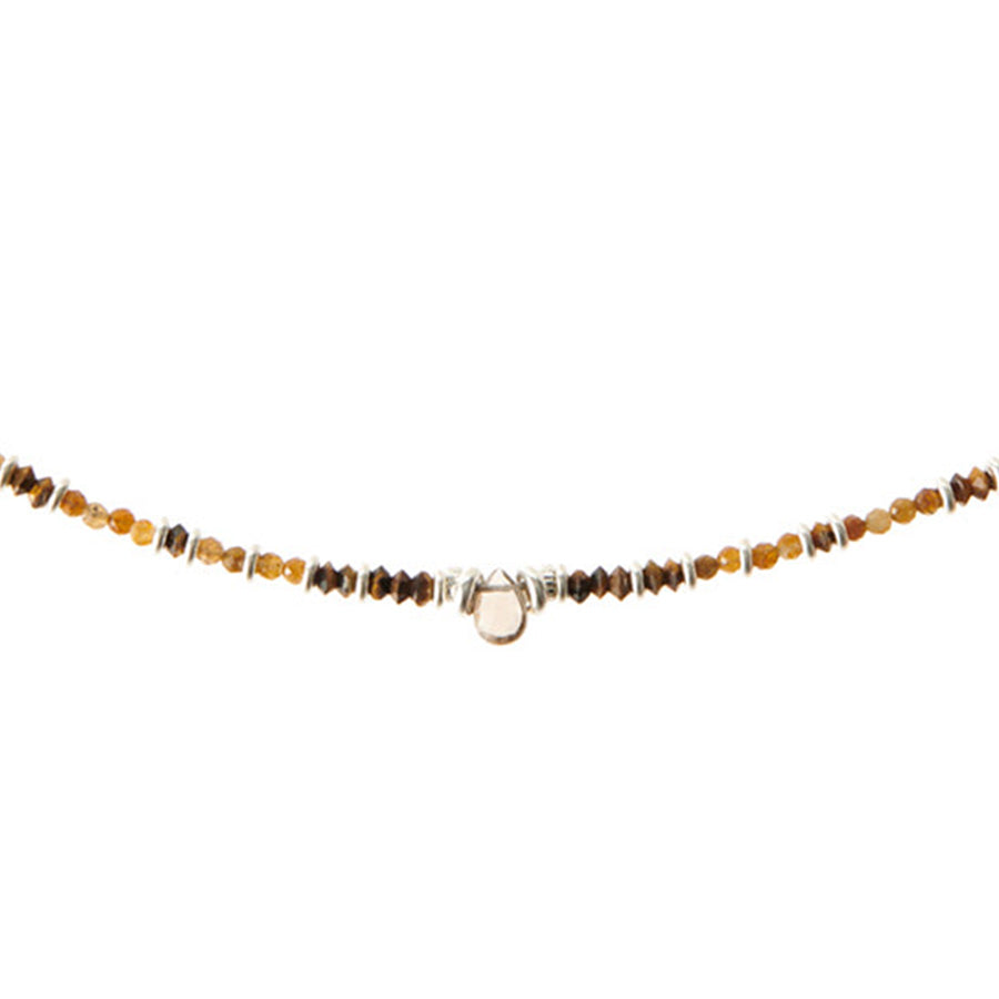 Gargantilla hecha a mano con combinación de piedras Turmalina y Ojo de Tigre naturales, diferentes tipos de entre piezas en plata de ley, y lagrimita central en piedra Cuarzo ahumado.