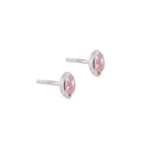 Pendientes tipo "botón" en forma de ojo trabajados en Plata de ley y piedra Rodocrosita de aproximadamente 3 x 5 mm.