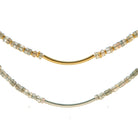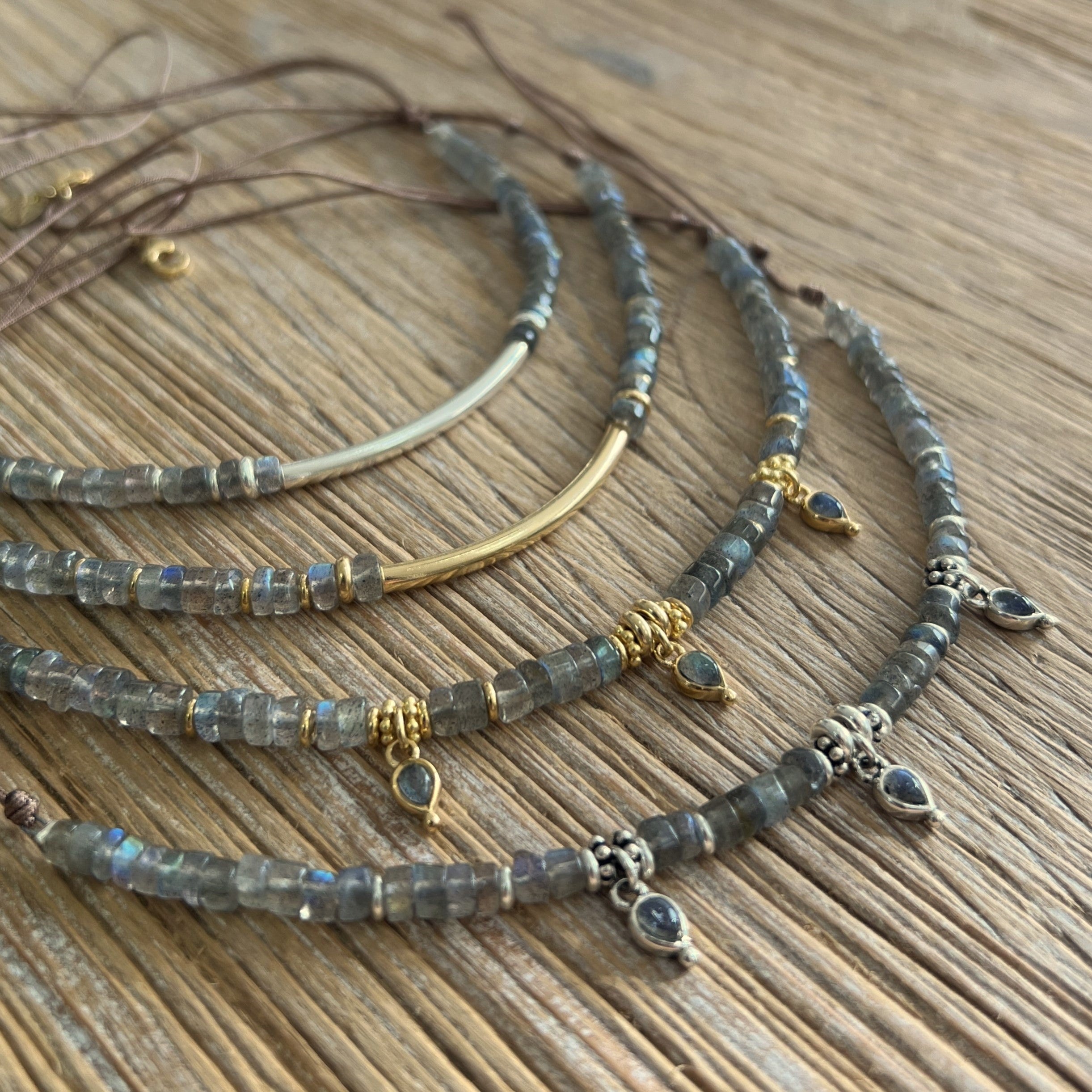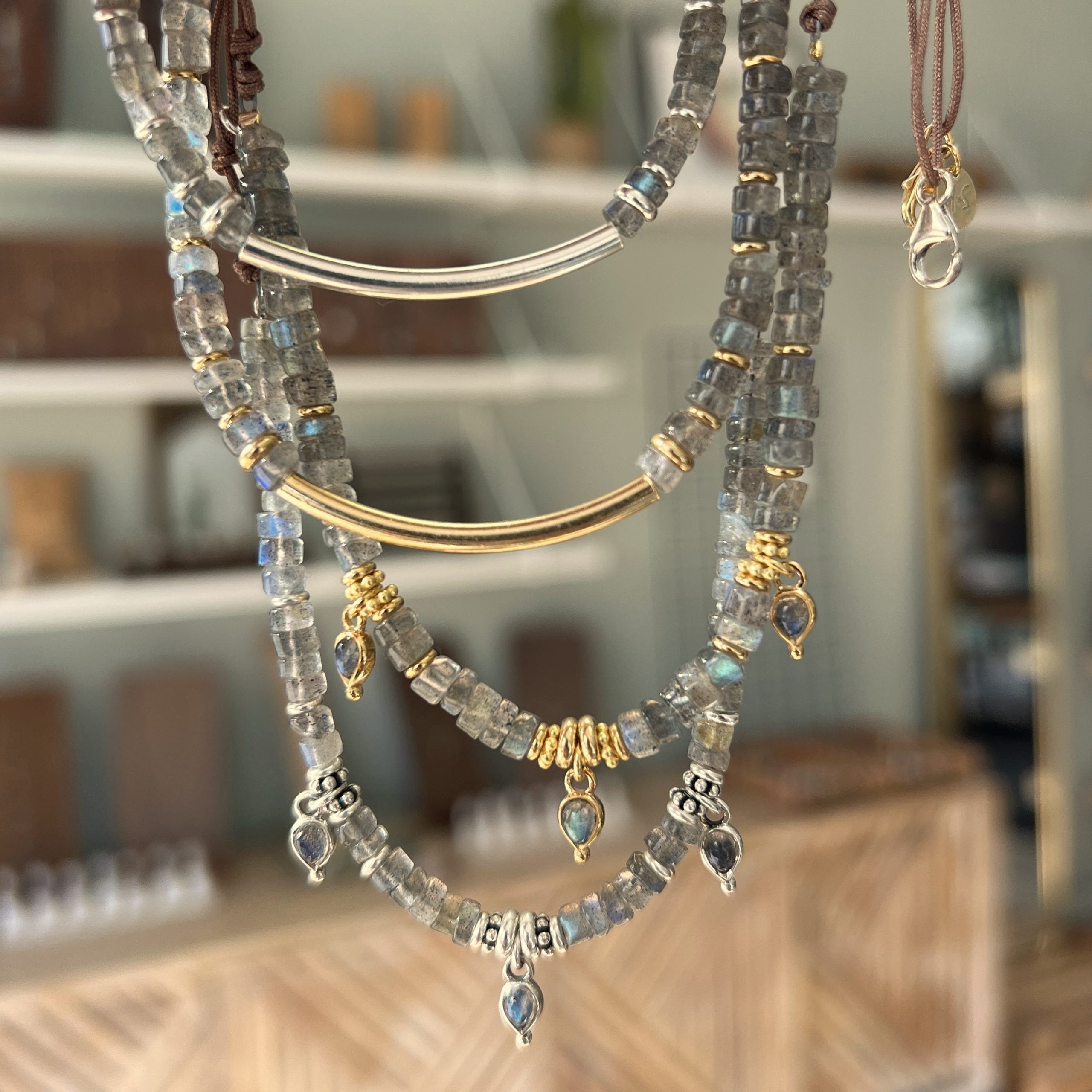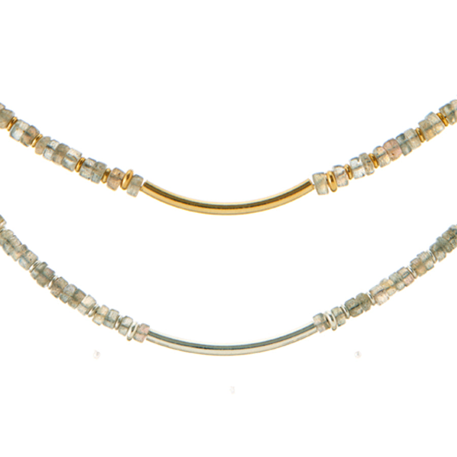 Gargantilla hecha a mano con piedra labradorita, entre piezas en plata de ley y pieza central con forma de tubo en pata de ley ó plata de ley con baño de oro de 18k.