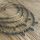 Largo ajustable, con terminación en hilo y nudo corredizo a lado y lado de la parte central de piedrecitas. Este tipo de collar puede llevarse cortito o largo dependiendo de con que otros collares lo combines!