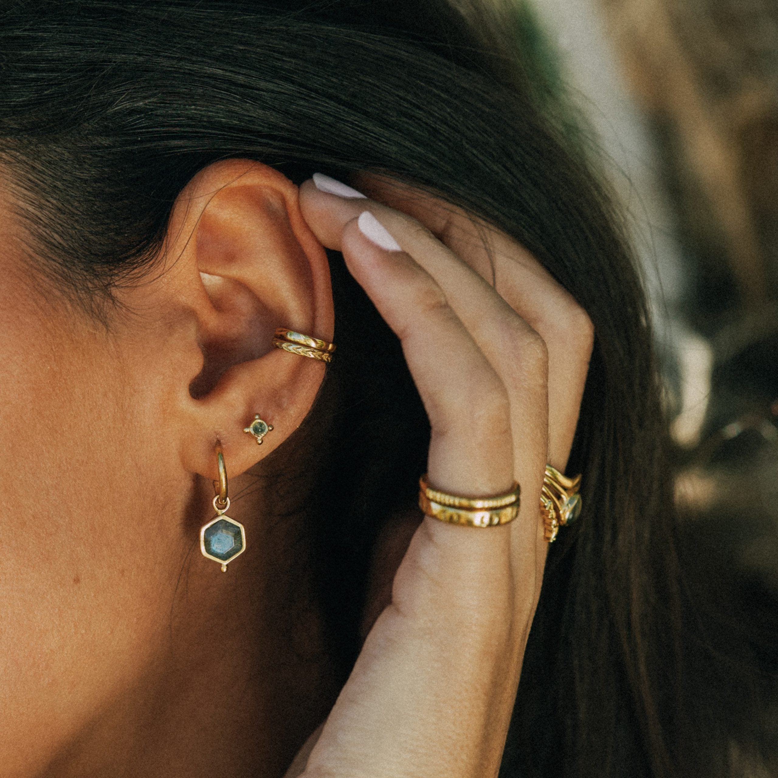 - Plata de Ley chapada en oro de 18/24k con 1 micra de espesor y labradorita natural.