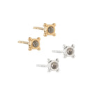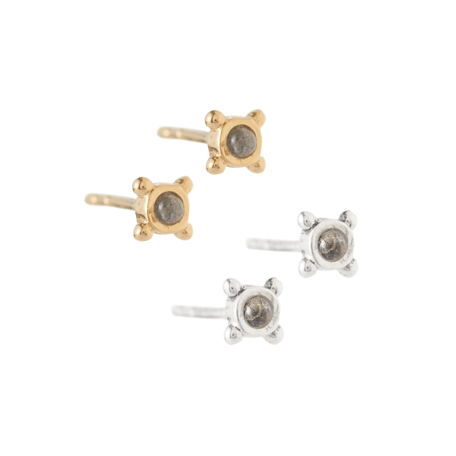 Pendientes tipo "botón" con cuatro bolitas en plata de ley ó plata de ley chapada en oro de 18/24k y piedra labradorita, de aproximadamente 3 mm de diámetro y 5 mm contando con las bolitas laterales.