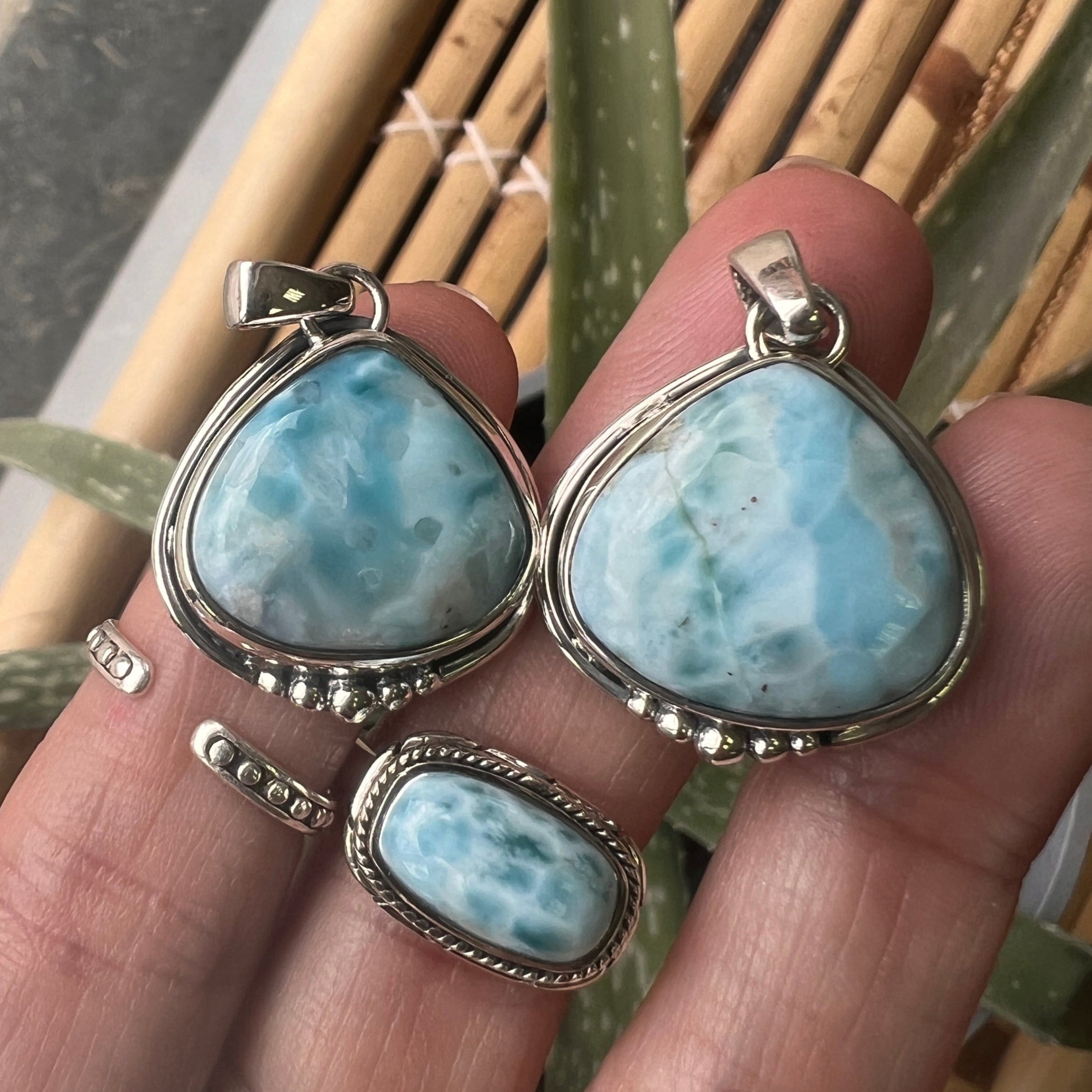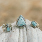 Anillo con piedra Larimar natural central en forma rectangular, trabajado en Plata de Ley oxidada, patina oscura que se le da a la plata 925 para crear un efecto envejecido que de profundidad al dibujo.