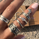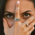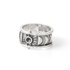 Anillo grueso de edición limitada con diseño de fases lunares y sol central de aproximadamente 10 mm de alto. Espectacular tanto para llevarlo en dedo índice cómo protagonista o en dedo corazón para acompañar a una piedra grande y potenciar su fuerza. Al ser un diseño muy potente sin piedra hace que sea un anillo muy versátil y un buen aliado para cualquier combinación.