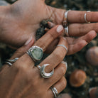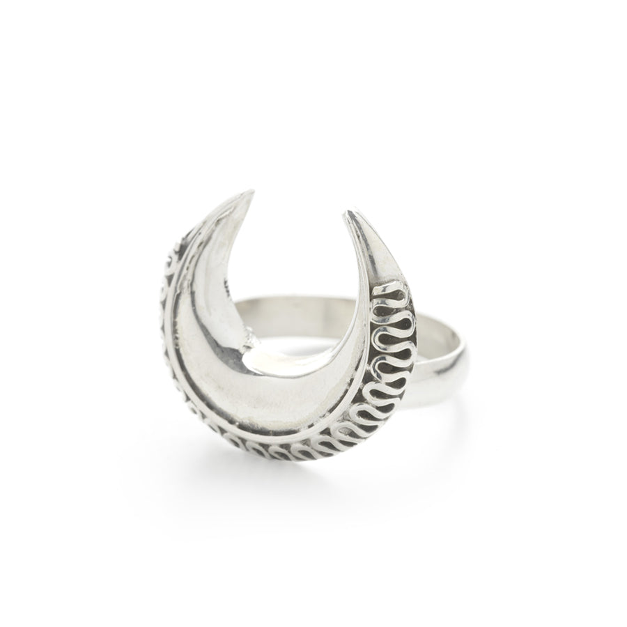 Anillo en forma de luna de aproximadamente 1,6 x 2,0 cm trabajada en Plata de Ley oxidada, patina oscura que se le da a la plata 925 para crear un efecto envejecido que de profundidad al dibujo.
