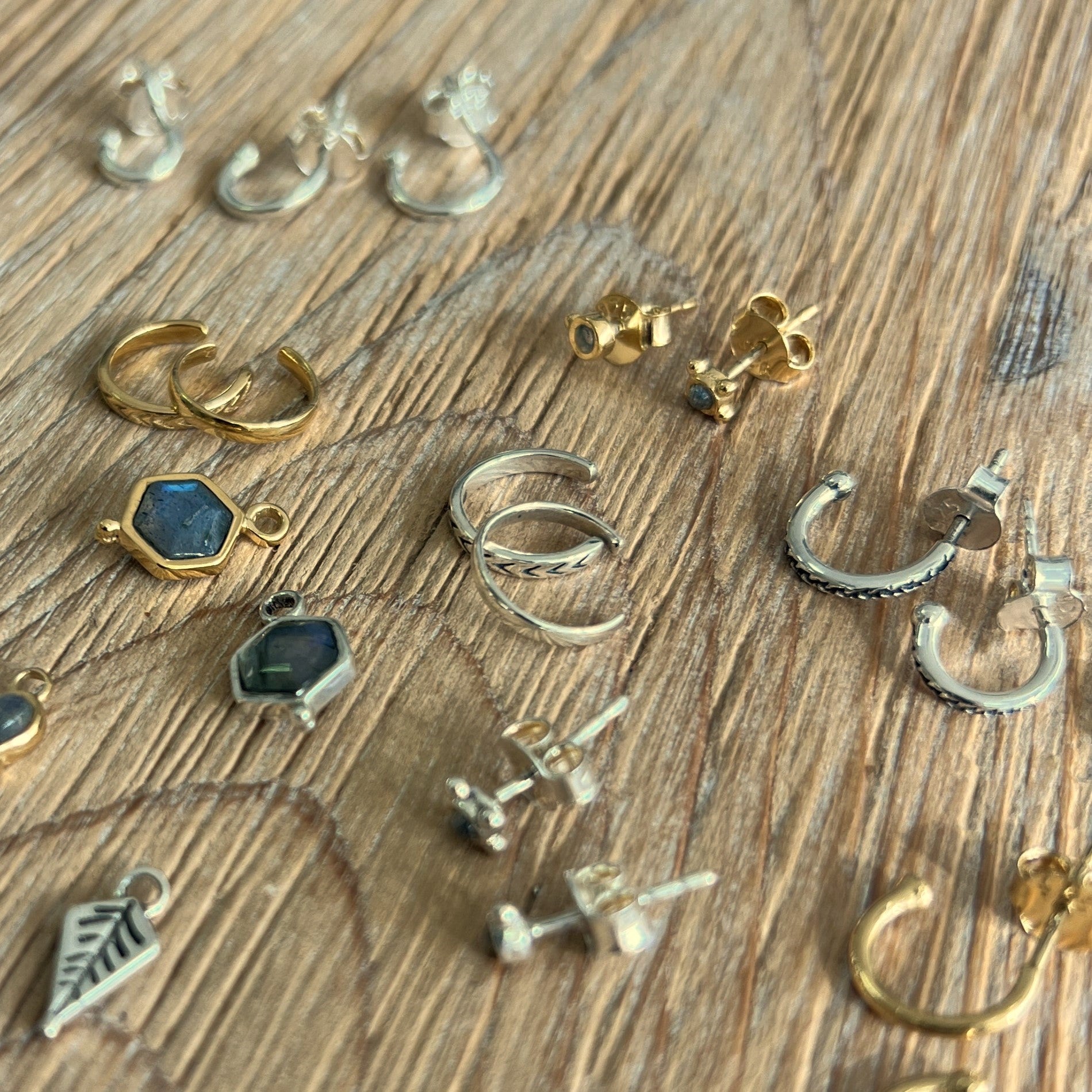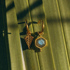 Charm para pendiente de Aro en forma de hexágono en plata de ley ó plata de ley chapada en oro de 18/24k y piedra labradorita, de aproximadamente 10 mm de altura. Material: - Plata de Ley y labradorita natural. - Plata de Ley chapada en oro de 18/24k con 1 micra de espesor y labradorita natural.