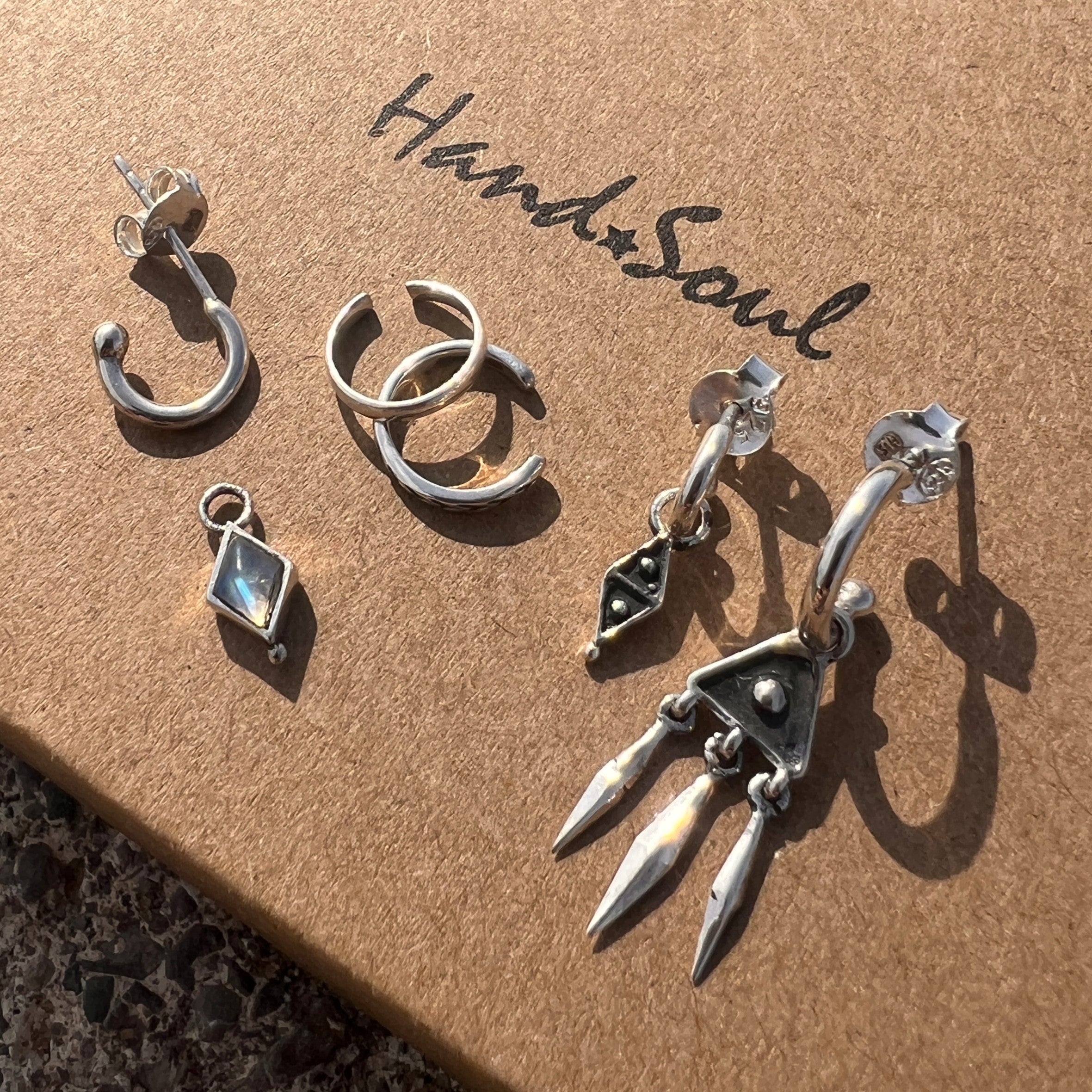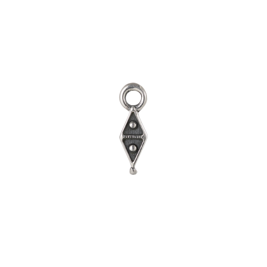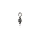 Charm para poner en pendiente tipo Aro en forma de Rombo de aproximadamente 8 mm de altura, trabajado en plata de ley con acabado oxidado (pátina oscura que se le da a la plata para crear un efecto envejecido que de profundidad al dibujo).