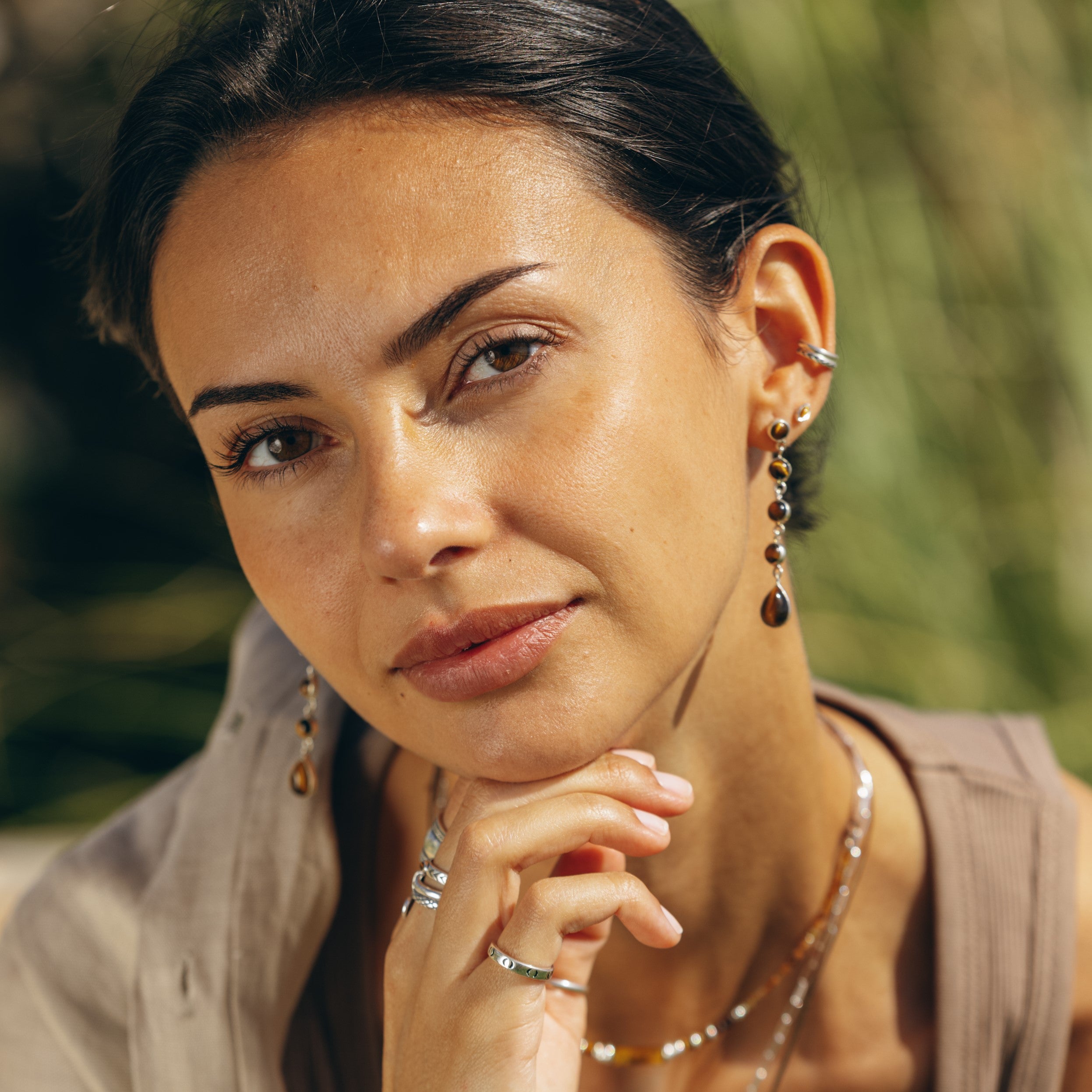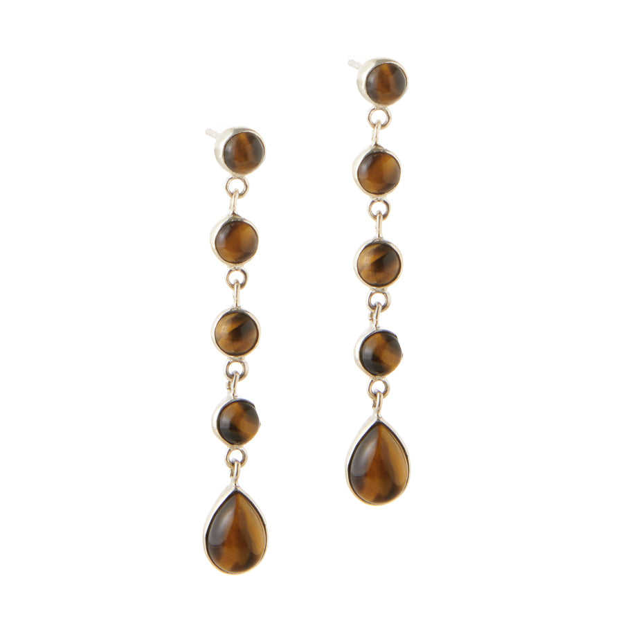 Pendientes largo tipo "botón" con piedras Tiger Eye naturales redonditas y lágrima final. Largo del pendiente 5cm aproximadamente.
