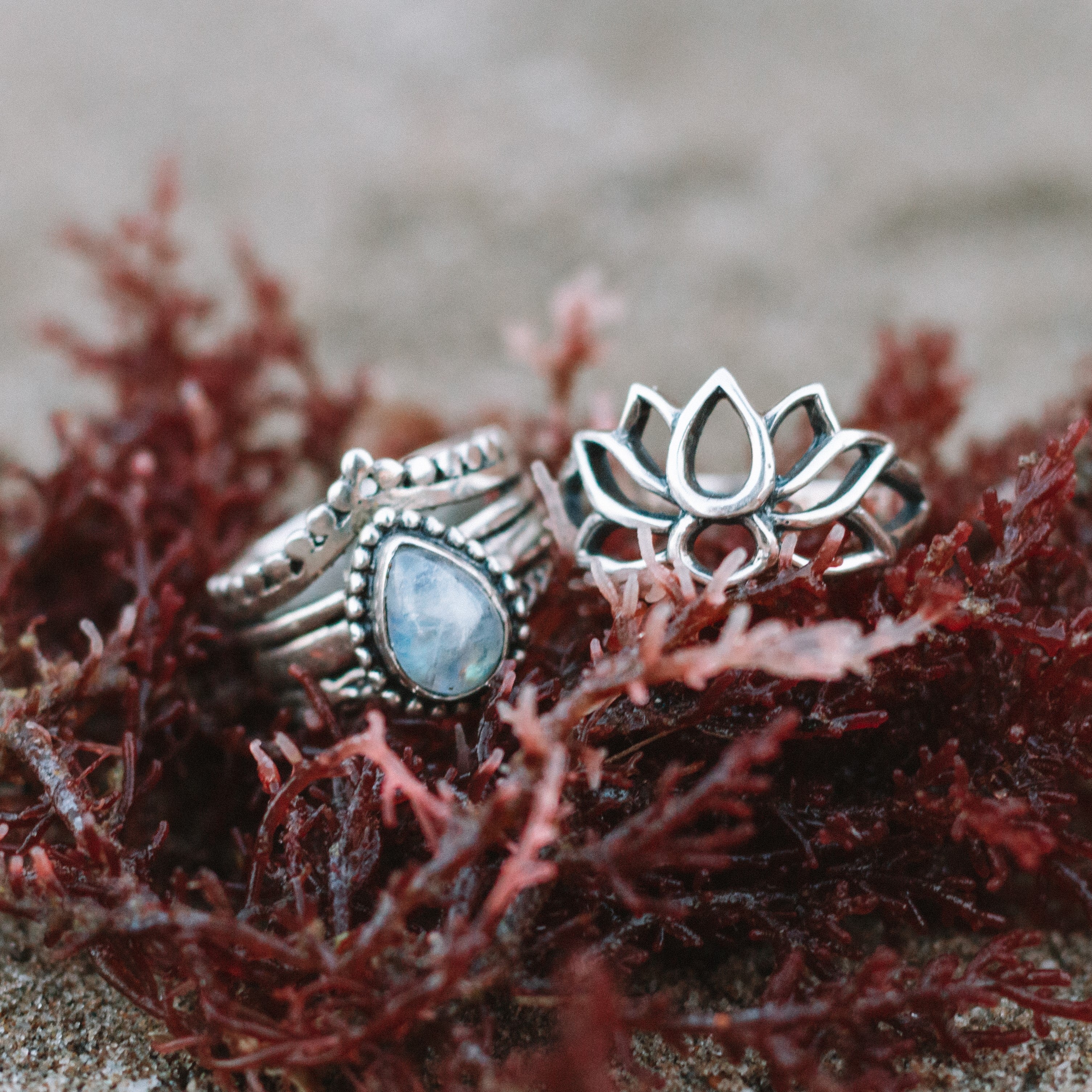 Anillo con piedra Luna natural central en forma de lágrima, trabajado en Plata de Ley oxidada, pátina oscura que se le da a la plata 925 para crear un efecto envejecido que de profundidad al dibujo.