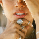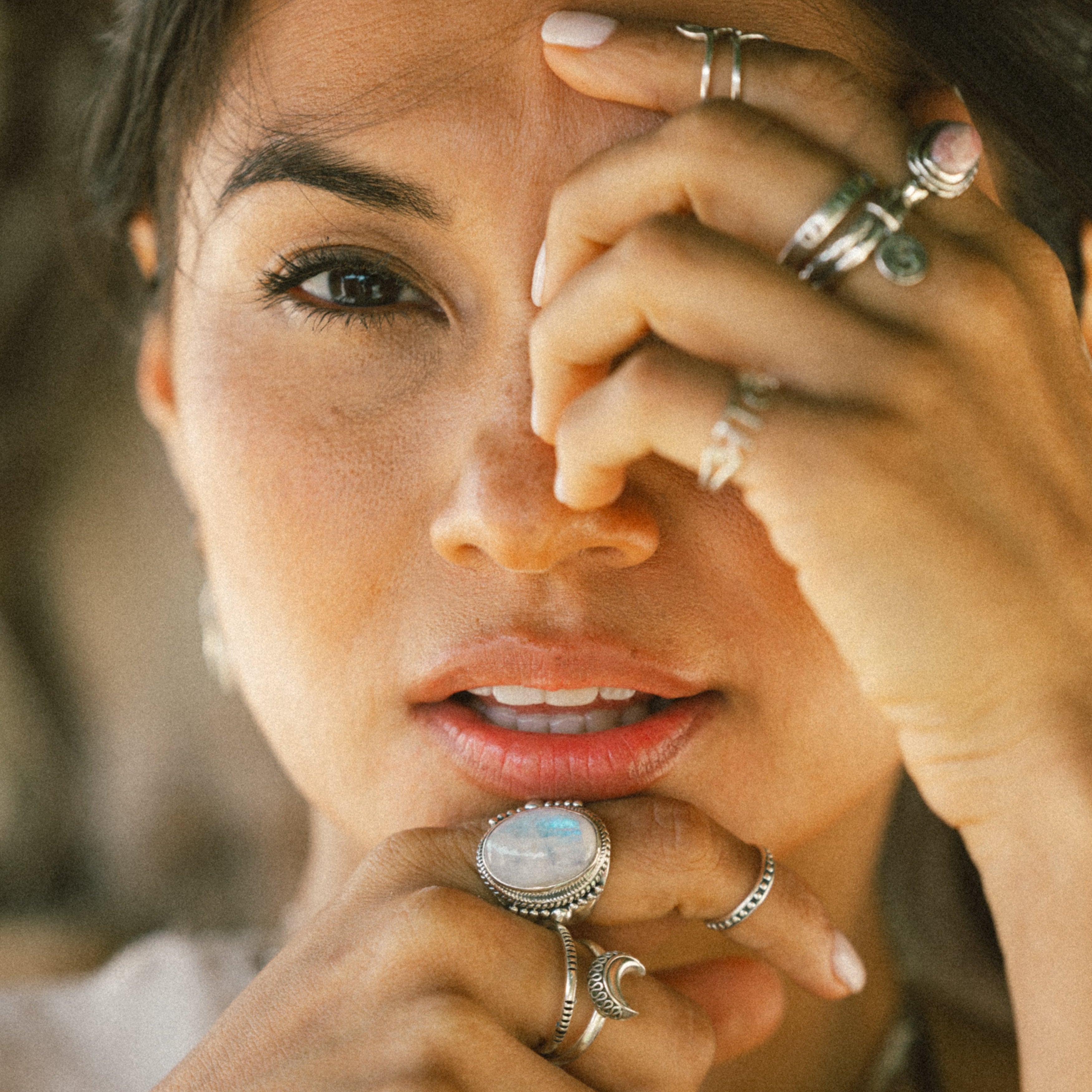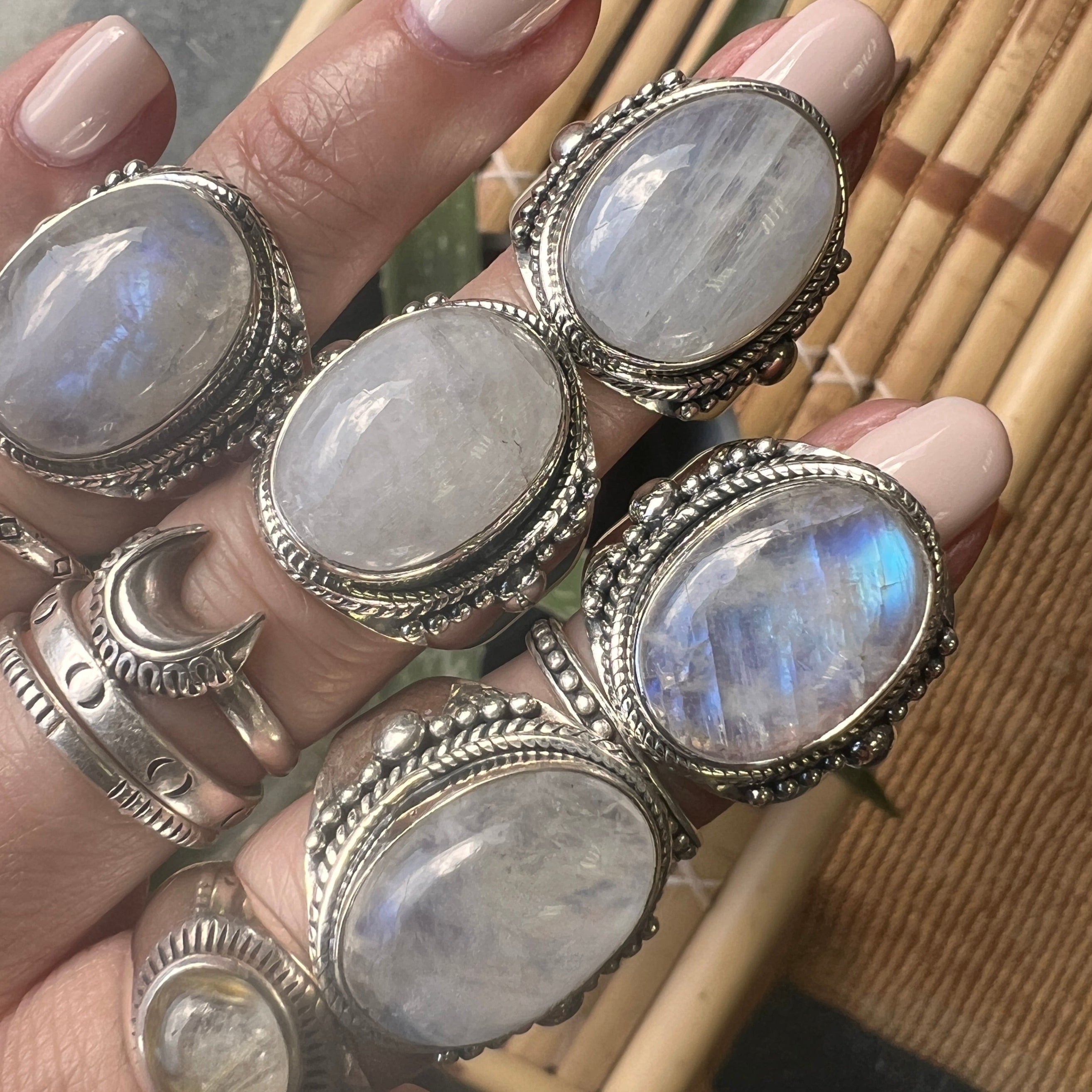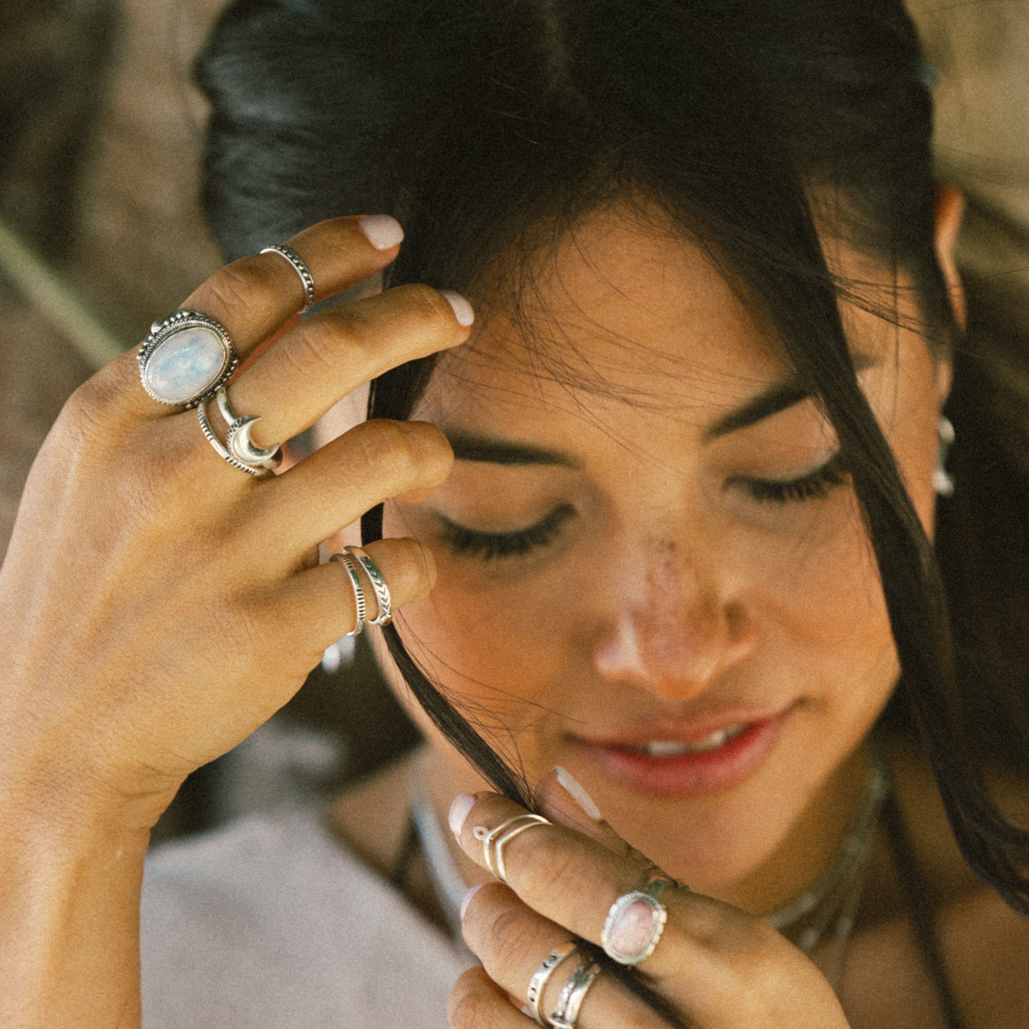 Anillo con piedra Luna natural central, trabajado en Plata de Ley oxidada, patina oscura que se le da a la plata 925 para crear un efecto envejecido que de profundidad al dibujo.