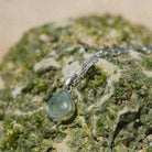 Cadena de eslabones con colgante trabajado en Plata de Ley y piedra Prehnita natural central. Colgante trabajado en forma de gota de aproximadamente 18 x 18mm, elaborado en Plata de Ley 925 con acabado oxidado (pátina oscura que se le da a la plata para crear un efecto envejecido que de profundidad al dibujo).