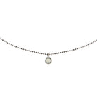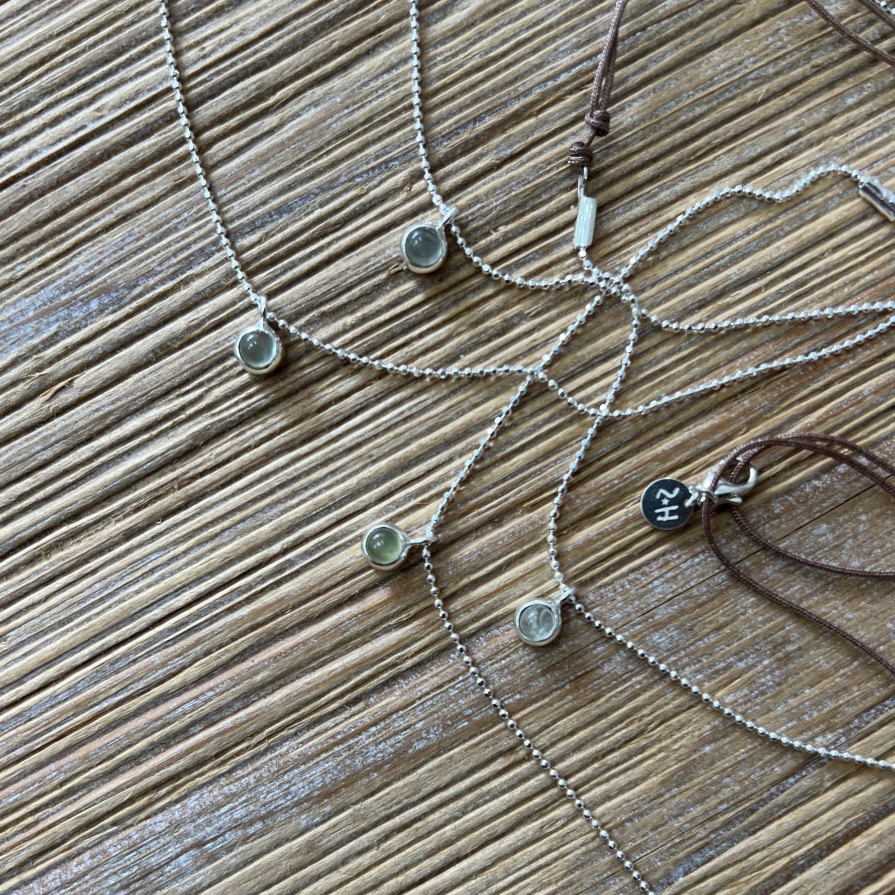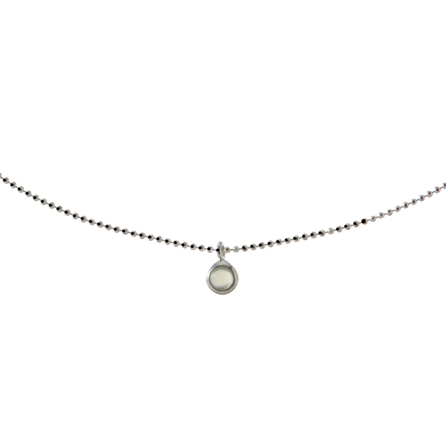 Choker elaborado con cadena diamantada central e terminación de hilo ajustable en sus extremos. Colgante central trabajado en Plata de Ley y piedra Prehnita natural de aproximadamente 5 mm de diámetro.