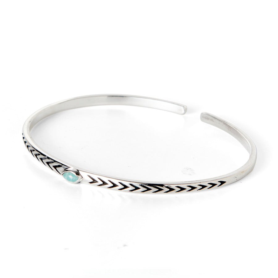 Pulsera rígida con piedra Amazonita natural central en forma de ojo de aproximadamente 2 x 4 cm trabajada en Plata de Ley oxidada, pátina oscura que se le da a la plata 925 para crear un efecto envejecido que de profundidad al dibujo.