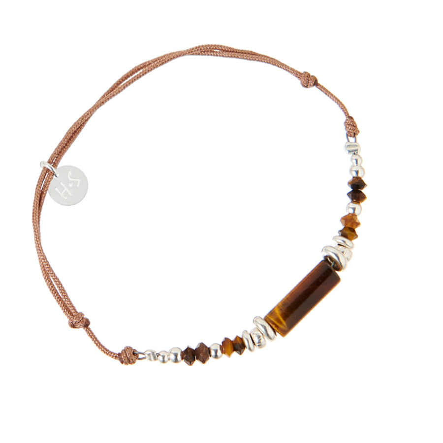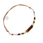 Pulsera hecha a mano con piedrecitas Ojo de tigre naturales, entre piezas en plata de ley y pieza central en forma de tubo también en piedra Ojo de tigre.