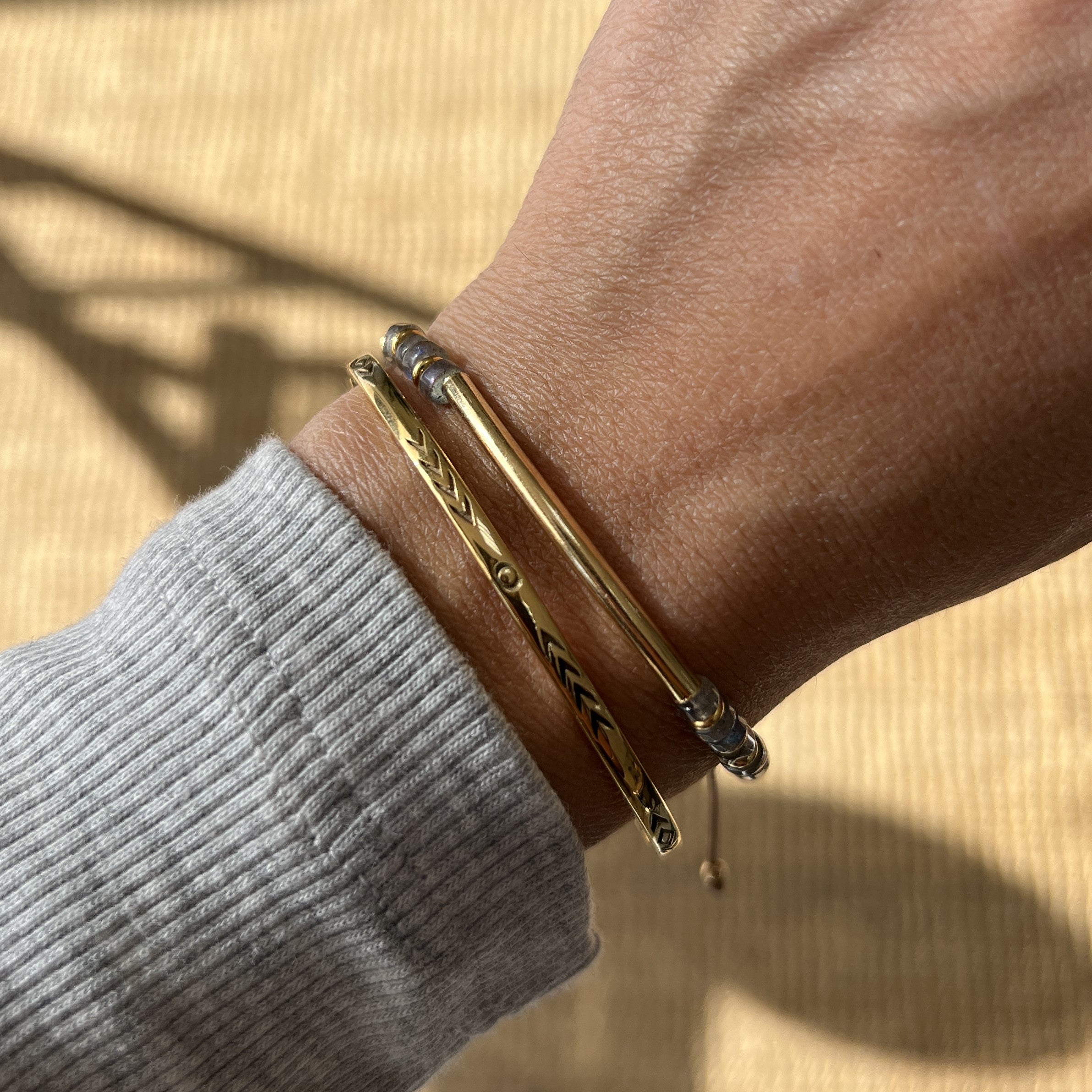 Pulsera hecha a mano con piedrecitas Labradoritas naturales, entre piezas en plata de ley con baño de Oro y pieza central en forma de tubo también en plata de ley con baño de Oro.