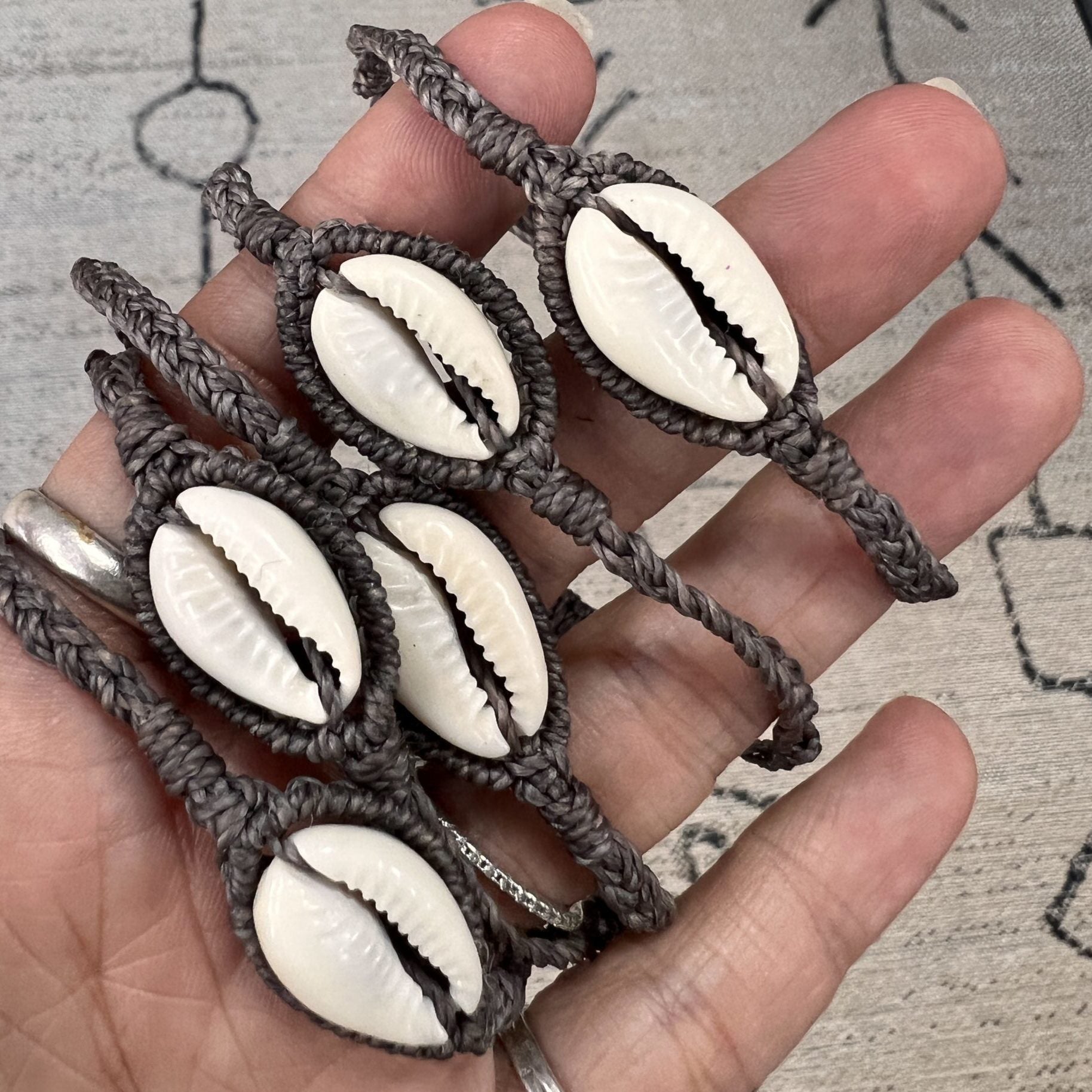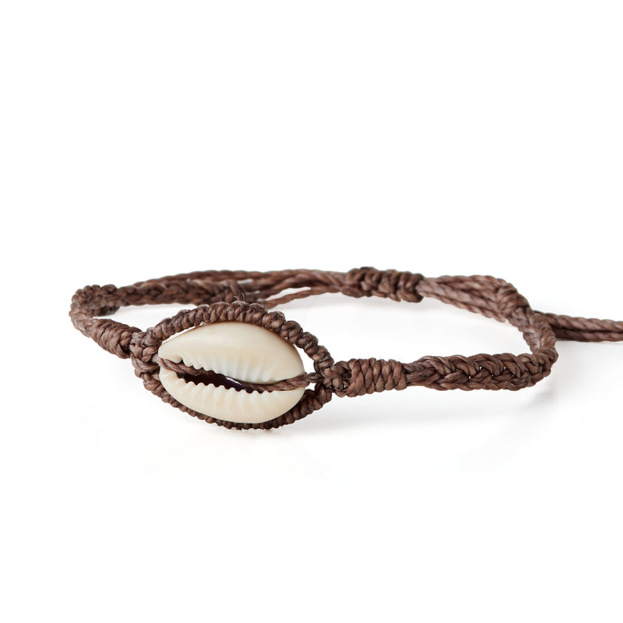 Pulsera hecha a mano en hilo ajustable color marrón con la técnica del macramé con concha natural central.