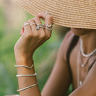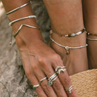 Pulsera hecha a mano con piedrecitas Nácar natural, entre piezas en plata de ley y pieza central en forma de tubo también en plata de ley o en plata de ley con chapado de oro.